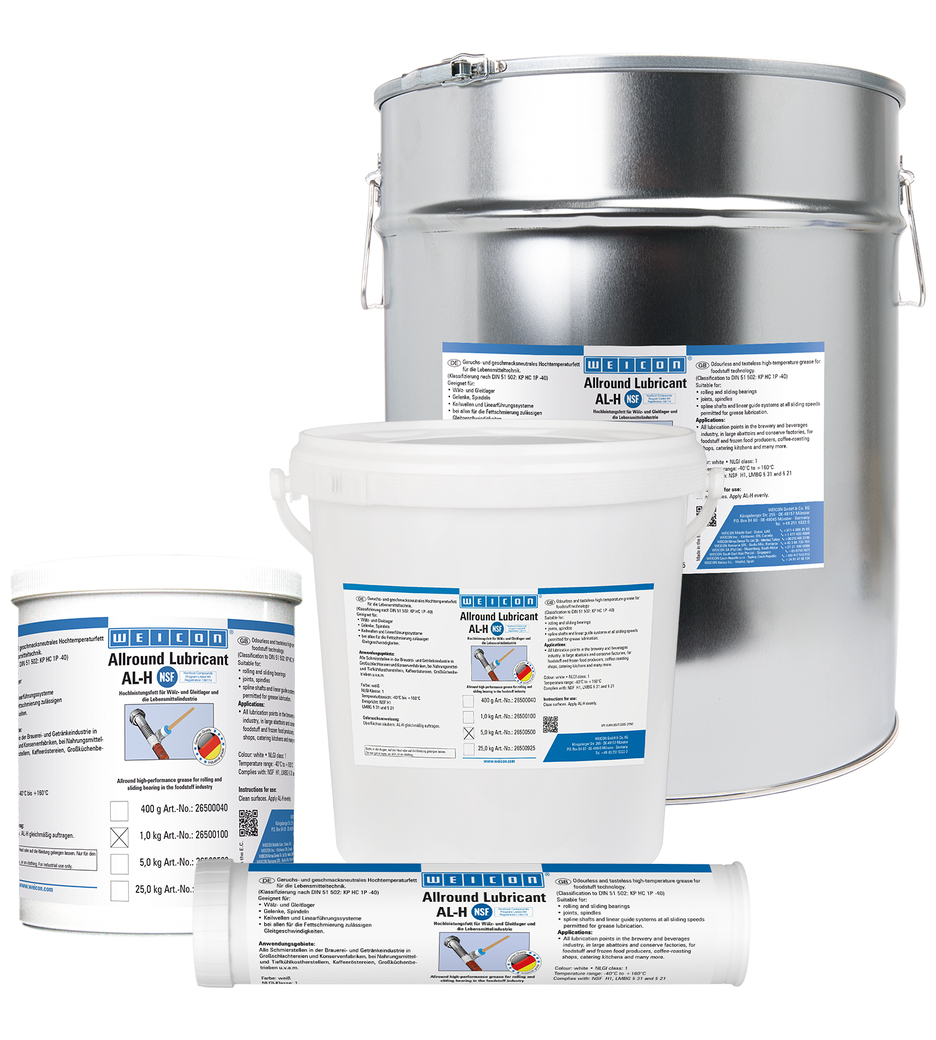 WEICON AL-H ist geeignet für Wälzlager, Gleitlager, Gelenke, Spindeln, Keilwellen und Linearführungssysteme bei allen für die Fettschmierung zulässigen Gleitgeschwindigkeiten. Durch die spezielle Formulierung und die NSF-Zulassung H1 eignet sich AL-H insbesondere für den Einsatz in der Lebensmitteltechnik.