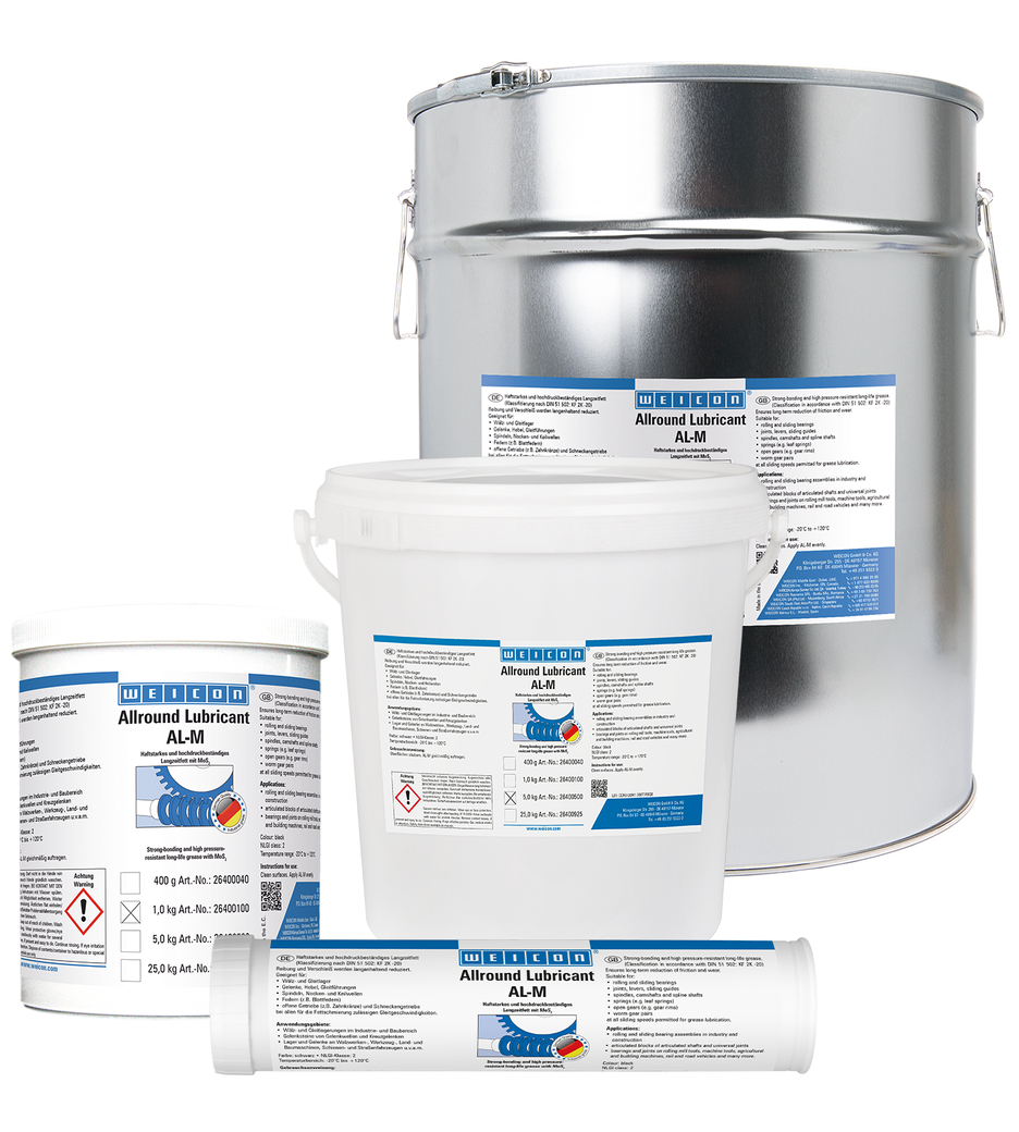 WEICON AL-M reduziert langanhaltend Reibung und Verschleiß und eignet sich für Wälz- und Gleitlager, Gelenke, Hebel, Gleitführungen, Spindeln, Nocken- und Keilwellen, Federn, offene Getriebe, Schneckengetriebe und bei allen für die Fettschmierung zulässigen Gleitgeschwindigkeiten.