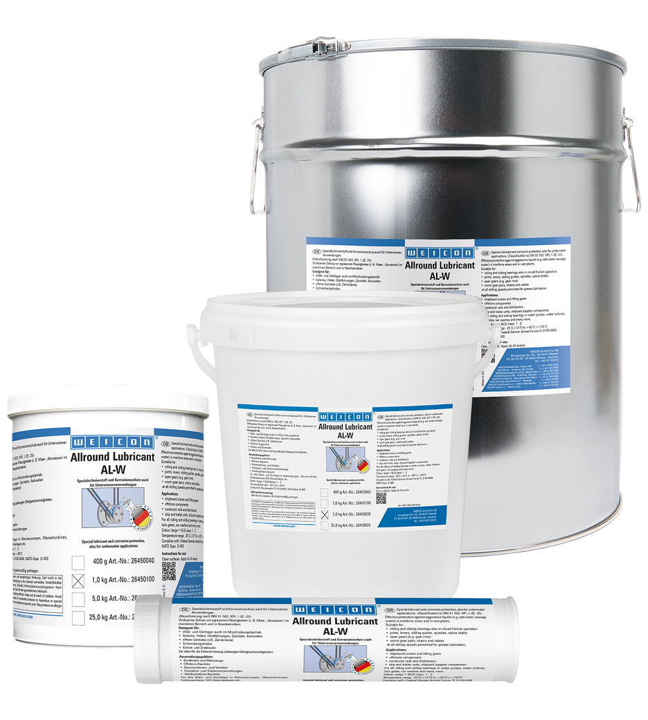 WEICON AL-W bietet wirksamen Schutz vor aggressiven Flüssigkeiten, wie Meer- oder Abwasser, sowohl im maritimen Bereich als auch in Nassbetrieben. Der Schmierstoff eignet sich für Wälz- und Gleitlager auch im Mischreibungsbetrieb, Gelenke, Hebel, Gleitführungen, Spindeln, Keilwellen, offene Getriebe, Schneckengetriebe, Ketten und Drahtseile – bei allen für die Fettschmierung zulässigen Gleitgeschwindigkeiten.