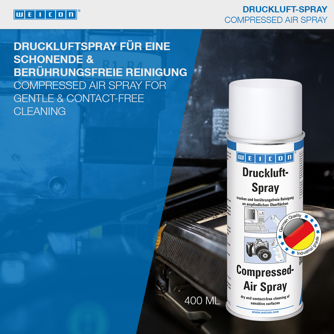WEICON Druckluft-Spray kann überall dort eingesetzt werden, wo Staub auf herkömmliche Weise nur schwer entfernt werden kann. Es erlaubt eine trockene, berührungsfreie Reinigung auch in unzugänglichen Winkeln und auf empfindlichen Oberflächen. Druckluft-Spray kann an Hifi- und Videogeräten, (z.B. Modulen, Leiterplatten, Magnetköpfen, Laufwerken etc.), in der Optik (z.B. Kameras, Objektive, Linsen), an KFZ-Sicherungskästen und -Scheibenwaschanlagen, an Uhrwerken (Quarzuhren), in der Medizintechnik, im Modellbau, in der Messtechnik, an Elektronikbauteilen und an Leiterplatten zum Einsatz kommen.