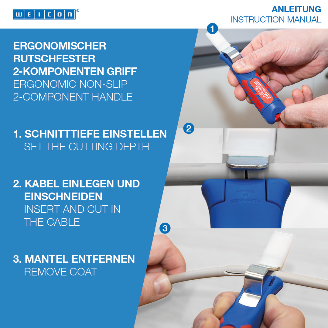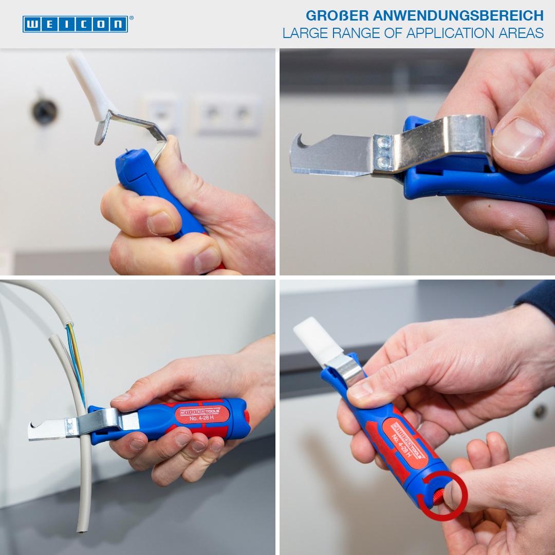 The Cable Stripper 4-28 H enables precise, fast and safe stripping of all common round cables with a diameter between 4 and 28 millimetres. The Cable Stripper has a non-slip, multi-component handle with ergonomic shape. Thanks to the set screw on the back of the handle, the cutting depth can be adjusted with an infinitely variable range. This prevents damaging the inner conductor. The cutting blade is integrated in the housing and self-rotating, thus enabling the automatic adjustment from circular to longitudinal cutting. In addition, the 4-28 H has a hook blade, which can be covered with a safety cap. The cap locks the blade safely, which significantly reduces the risk of injury.