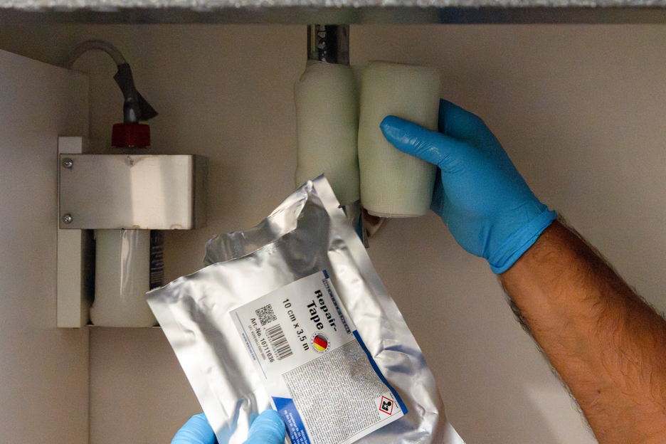 Flexible, durable and self-fusing repair tape made of glass-fibre reinforced plastic for quick emergency repairs in indoor or outdoor areas. The tape is soaked with a special resin and is activated by contact with water. It can be applied very easily and fast and shows very high adhesive strength on almost all surfaces. After just 30 minutes, the tape is fully cured and hard-wearing. After curing, the tape can be sanded and painted over. It has high chemical and temperature resistance – from 50 °C / (-58 °F) to +150 °C (302 °F) for short periods. The tape can be applied without additional tools and is used for reliable and durable repairs in industrial applications, skilled trades, around the house, and in the camping and DIY sector.