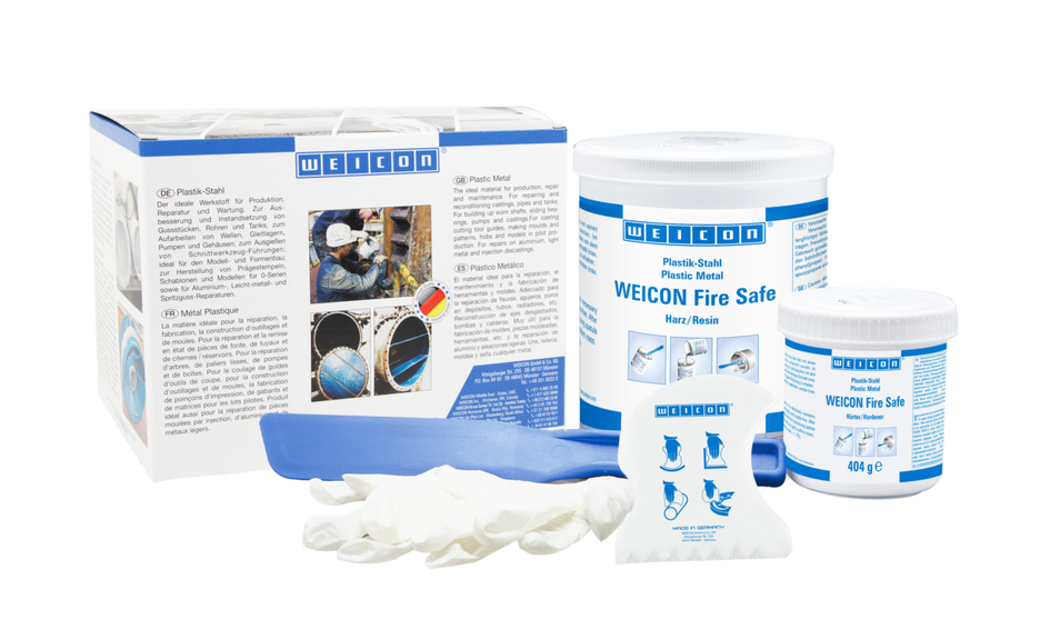 WEICON Fire Safe is a white, flame-retardant 2-component adhesive that can be applied with a spatula. It is suitable for applications in the fire protection sector and is used for fastening wear protection ceramics or steel parts to a wide variety of surfaces, such as metal, concrete or similar materials. The adhesive system is very strong, hard-flexible after curing and has been modified to be impact-resistant. The adhesive does not become brittle even under the most extreme conditions. It exhibits good wear protection properties in the event of particle erosion, has good chemical resistance and is solvent-free. WEICON Fire Safe contains additives that cause self-extinguishing within a few seconds. It was tested in accordance with EN 13501-1:2018 (EN 13823 and EN ISO 11925-2) and classified as B‑s3, d0. The special adhesive can be used in many areas of application, e.g. for fastening fire barriers and covers or components with fire resistance requirements. Fire Safe can be used in a wide variety of industrial areas, e.g. in refineries, in cement production, in the chemical industry, in tank construction, valve construction or insulation technology.