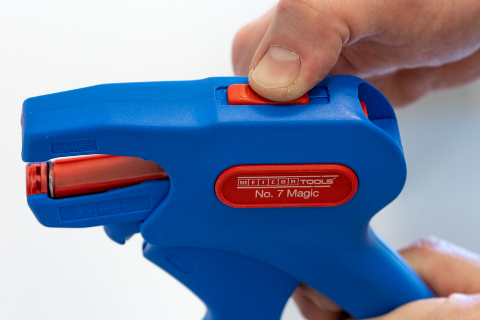 WEICON Wire Stripper No .7 Magic is a robust, ergonomic automatic wire stripper. The automatic scanning system is adjustable to different cable types and diameters with another 5-fold fine adjustment. The fibreglass-reinforced wire stripper has visual length scale from 8 - 24mm. This way, all flexible stranded cables from 0.5mm² - 16mm² and solid round cables from 0.5mm² - 10mm² are efficiently and evenly stripped. The stripper is also suitable for 2-core PVC