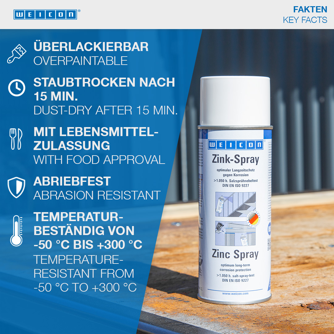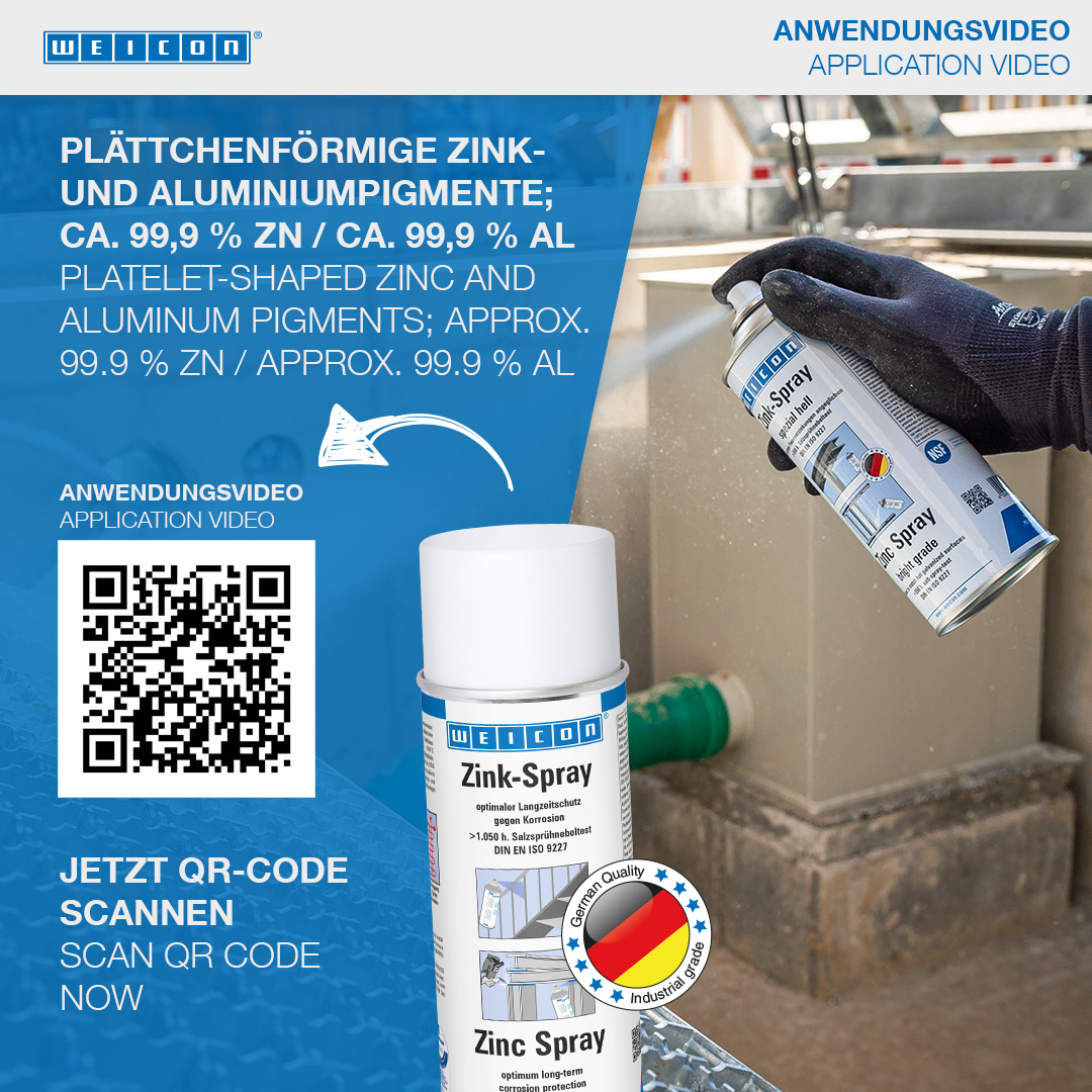 WEICON Zinc Spray is approved by the German TÜV and provides all metal surfaces with a long-lasting cathodic corrosion protection. It forms a fast-drying, adherent protective layer of microfine zinc flakes. Even after more than 1050 hours in the salt spray test according to DIN EN ISO 9227, metal parts coated with WEICON Zinc Spray did not show any signs of corrosion. The zinc flakes form a resistant protective layer even against extreme weather and environmental conditions. That way, WEICON Zinc Spray fulfils higher requirements than those defined by the DIN EN ISO 1461 standard. WEICON Zinc Spray can be used as a high-grade anti-rust primer, for the coating of welded joints and drill holes, as a conductive intermediate layer for spot welding and wherever metal must be protected against corrosion.