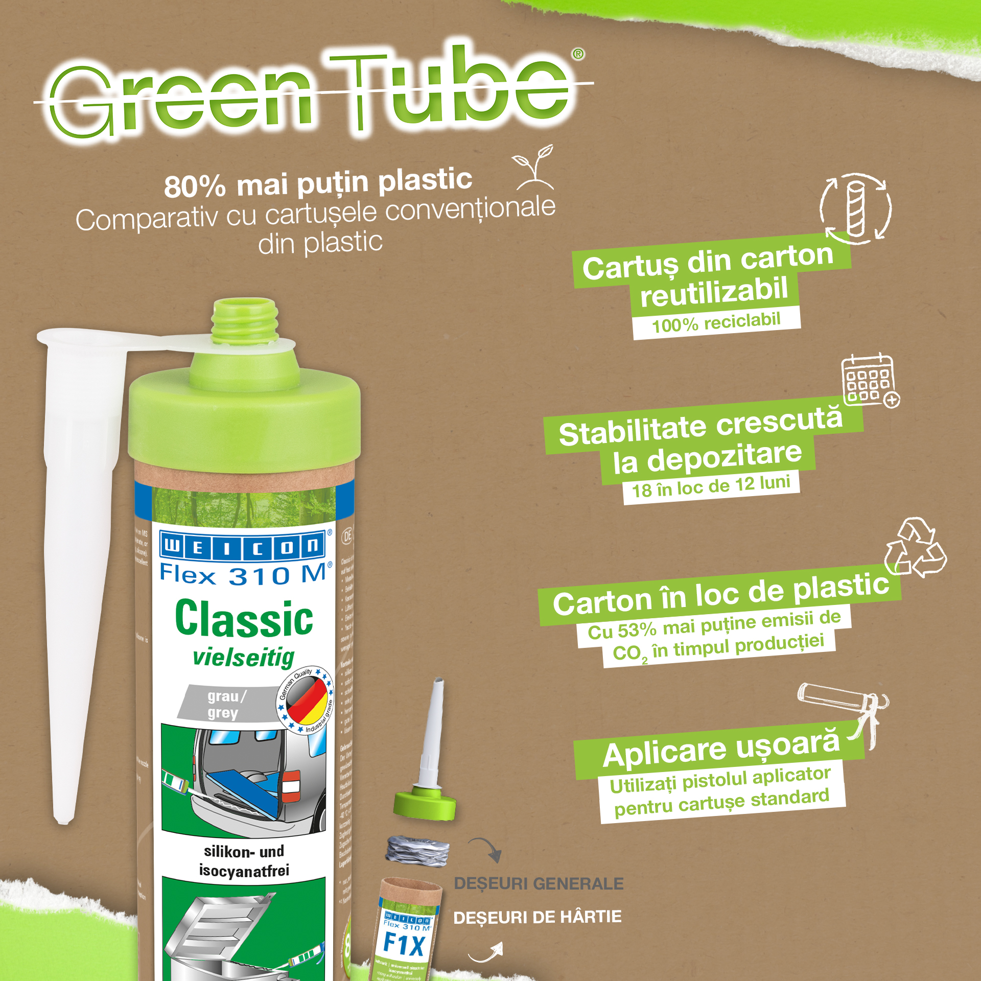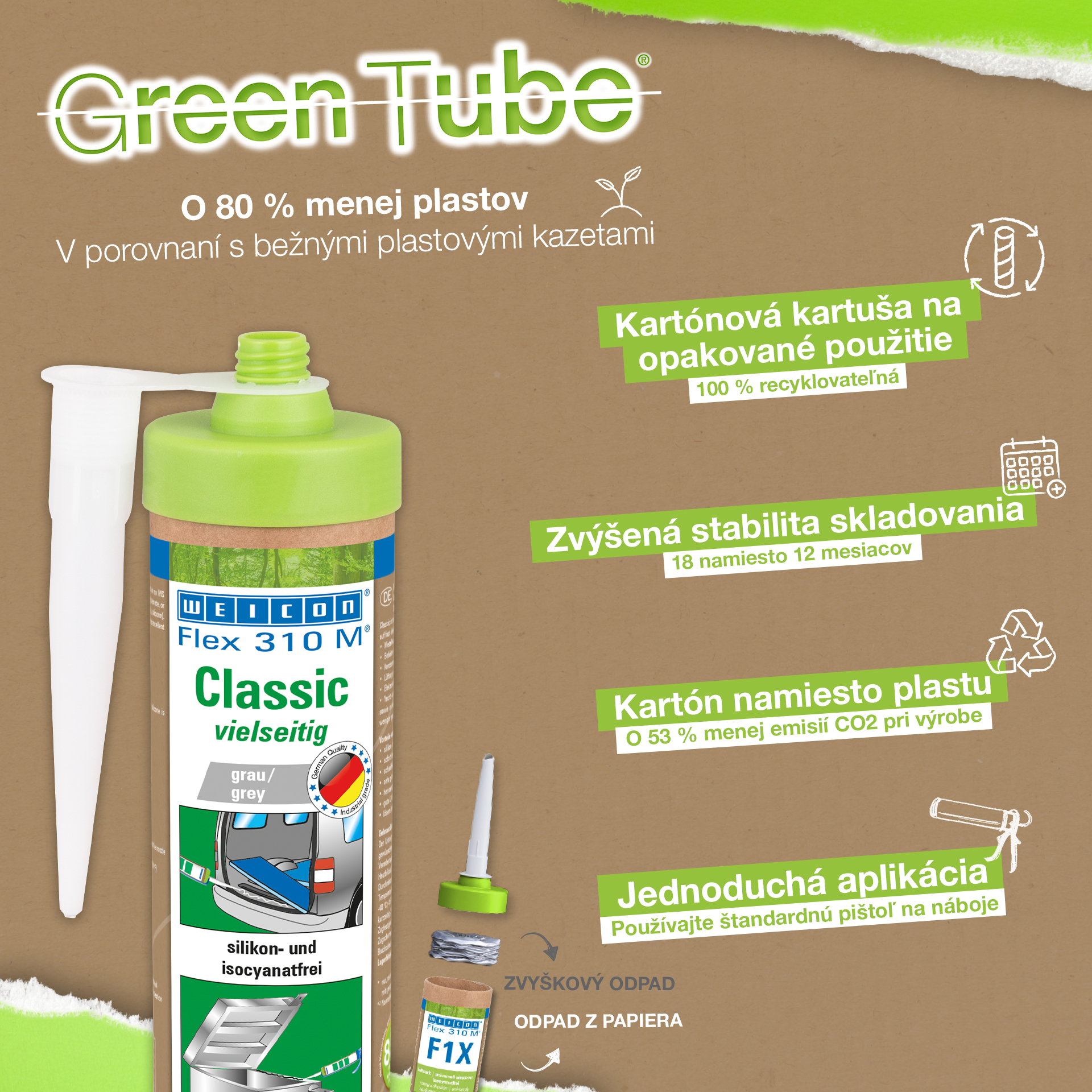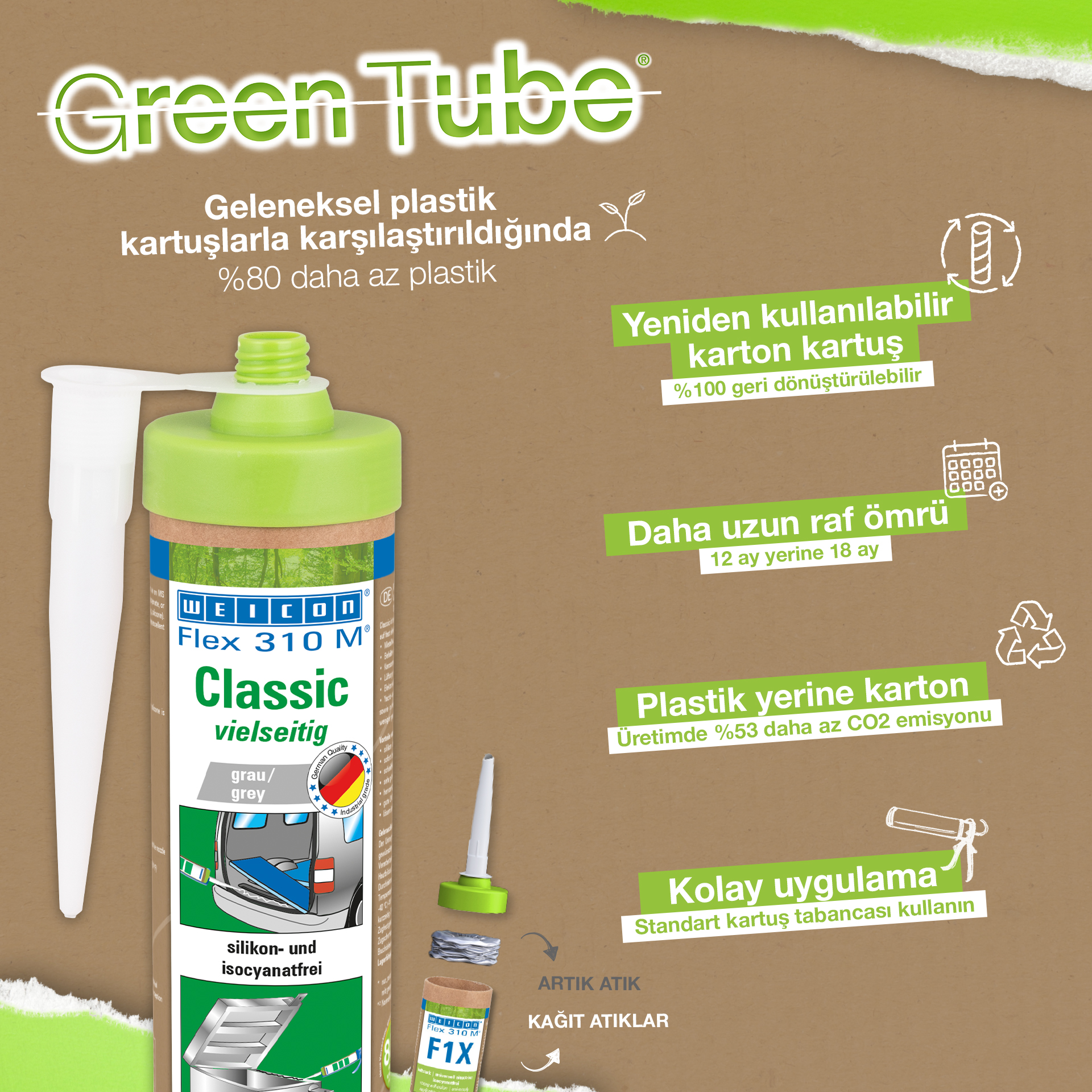 WEICON Flex 310 M Classic ist haftstark, „nass in nass“ überlackierbar, schleiffähig, hat eine hervorragende Alterungsbeständigkeit und eine gute UV-Stabilität. Es ist beständig gegenüber Süß- und Salzwasser und ist silikon-, isocyanat-, halogen- und lösemittelfrei. Das Produkt ist ISEGA zertifiziert und kann als Klebstoff in der Lebensmitteltechnologie verwendet werden. Flex 310 M Classic ist ein elastischer Klebstoff auf MS-Polymer-Basis und eignet sich für Verklebungen von Metallen, vielen Kunststoffen, Keramik, Holz, Glas und Stein. Der Kleb- und Dichtstoff kann im Metallbau, im Behälter- und Apparatebau, im Karosserie-, Fahrzeug- und Containerbau, in der Lüftungs- und Klimatechnik, in der Elektroindustrie, im Yacht- und Bootsbau und überall dort, wo Silikone bzw. silikonhaltige Produkte nicht geeignet sind, zum Einsatz kommen.