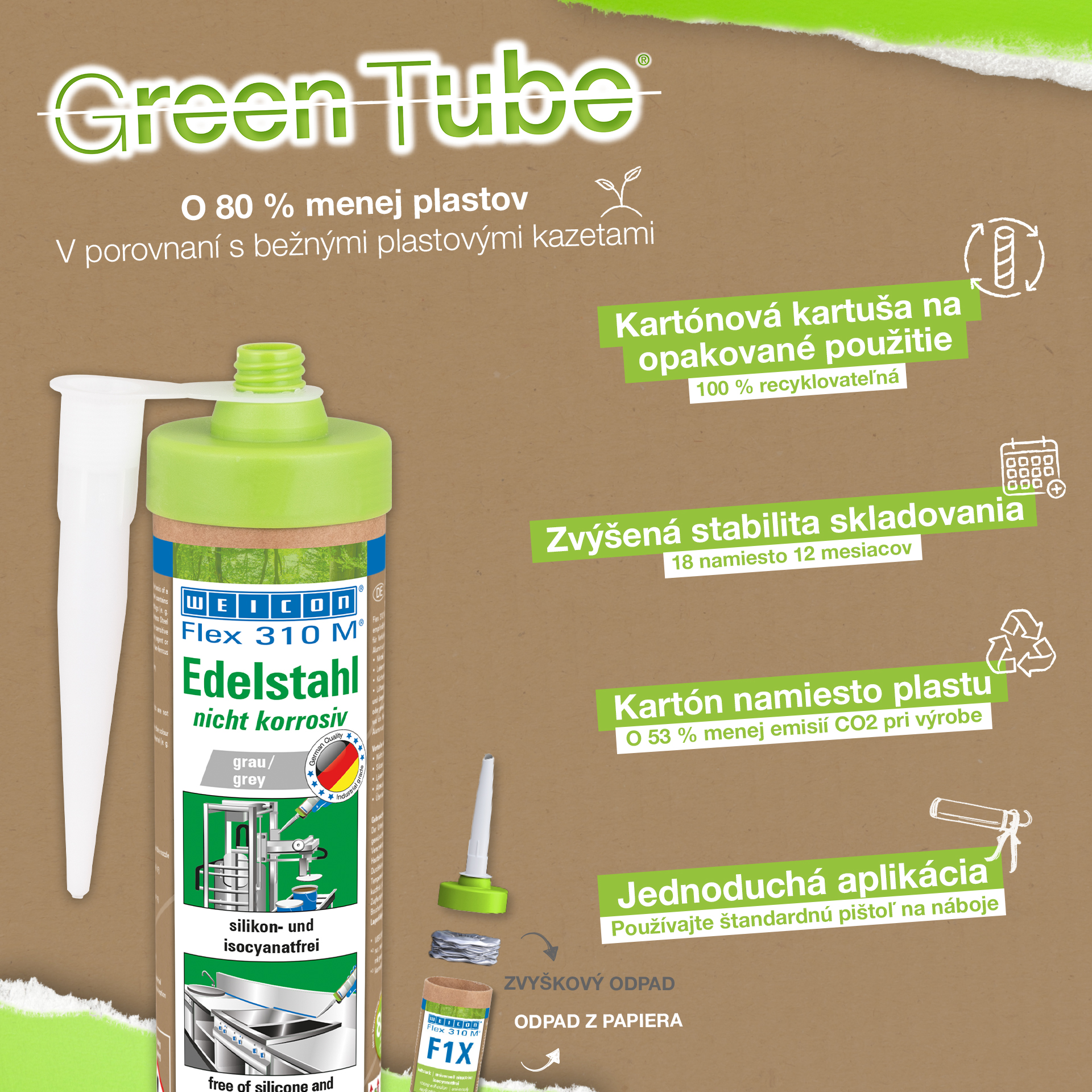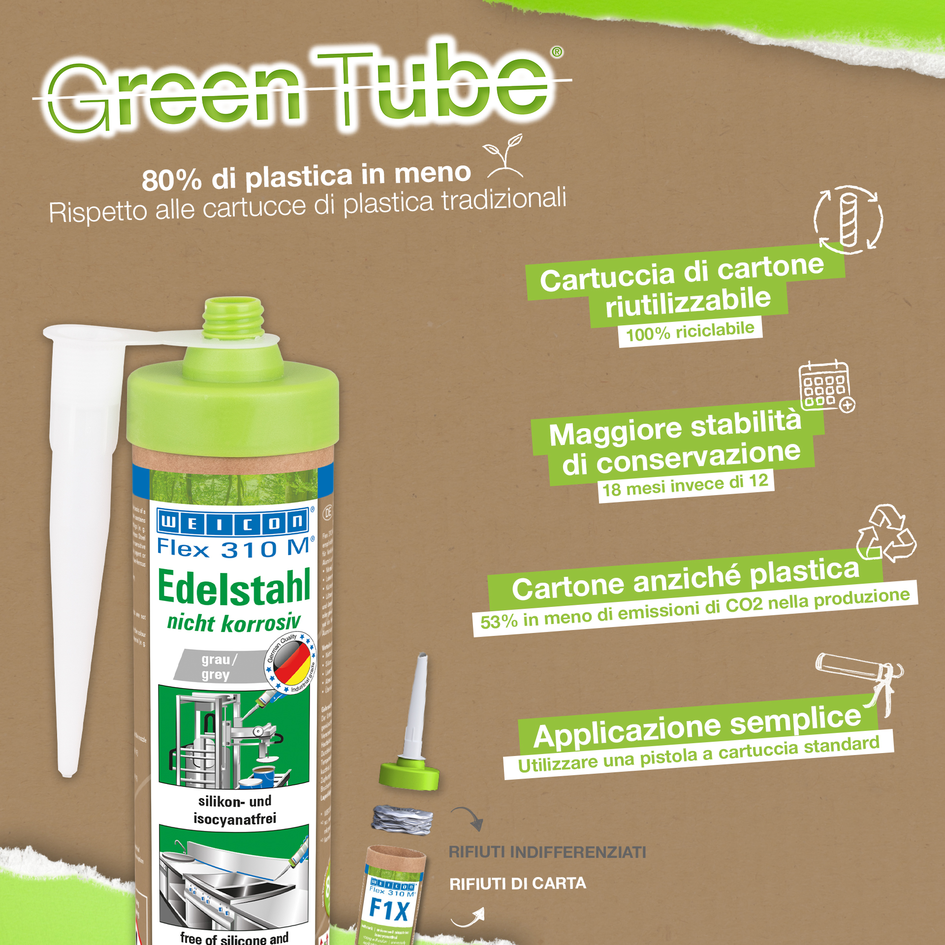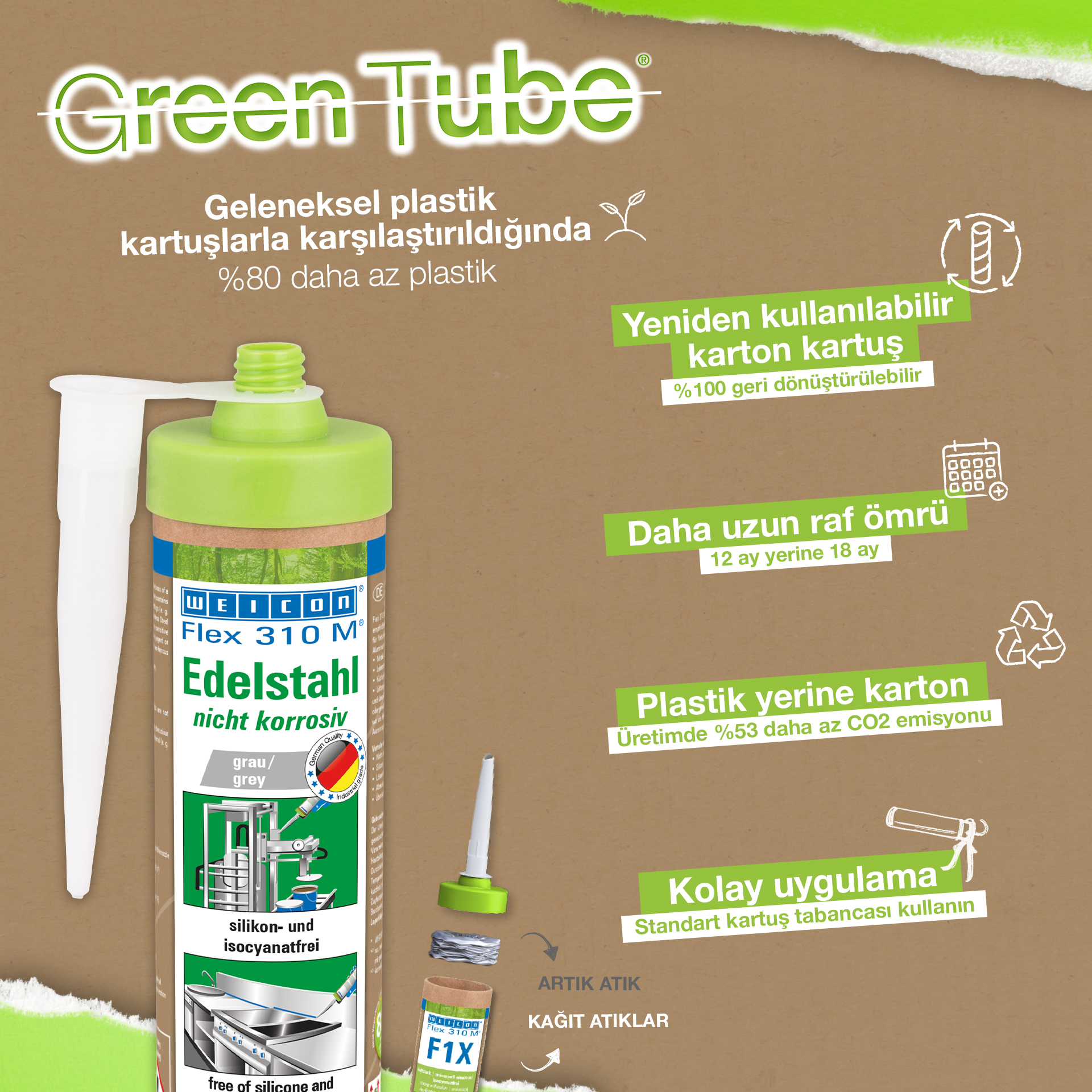 Der Kleb- und Dichtstoff WEICON Flex 310 M Edelstahl ist haftstark, „nass in nass“ überlackierbar, schleiffähig, alterungsbeständig, UV-stabil und ist silikon-, isocyanat-, halogen- und lösemittelfrei und nicht korrosiv. Das Produkt ist ISEGA zertifiziert und kann als Klebstoff in der Lebensmitteltechnologie verwendet werden. Flex 310 M Edelstahl ist ein elastischer Klebstoff auf MS-Polymer-Basis und eignet sich für Verklebungen sowie Naht- und Fugenabdichtungen an Metallen, wie Edelstahl, Aluminium und Buntmetallen. Es wird darüber hinaus auch überall dort eingesetzt, wo die Farbe des Dicht- und Klebstoffes dem Material (z.B. Edelstahl, Aluminium, etc.) angepasst sein soll. WEICON Flex 310 M Edelstahl kann im Metallbau, im Behälter- und Apparatebau, in der Lebensmittelindustrie, im Küchenbau und Sanitärbereich, in der Lüftungs- und Klimatechnik und überall dort, wo Silikone bzw. silikonhaltige Produkte nicht geeignet sind, zum Einsatz kommen.