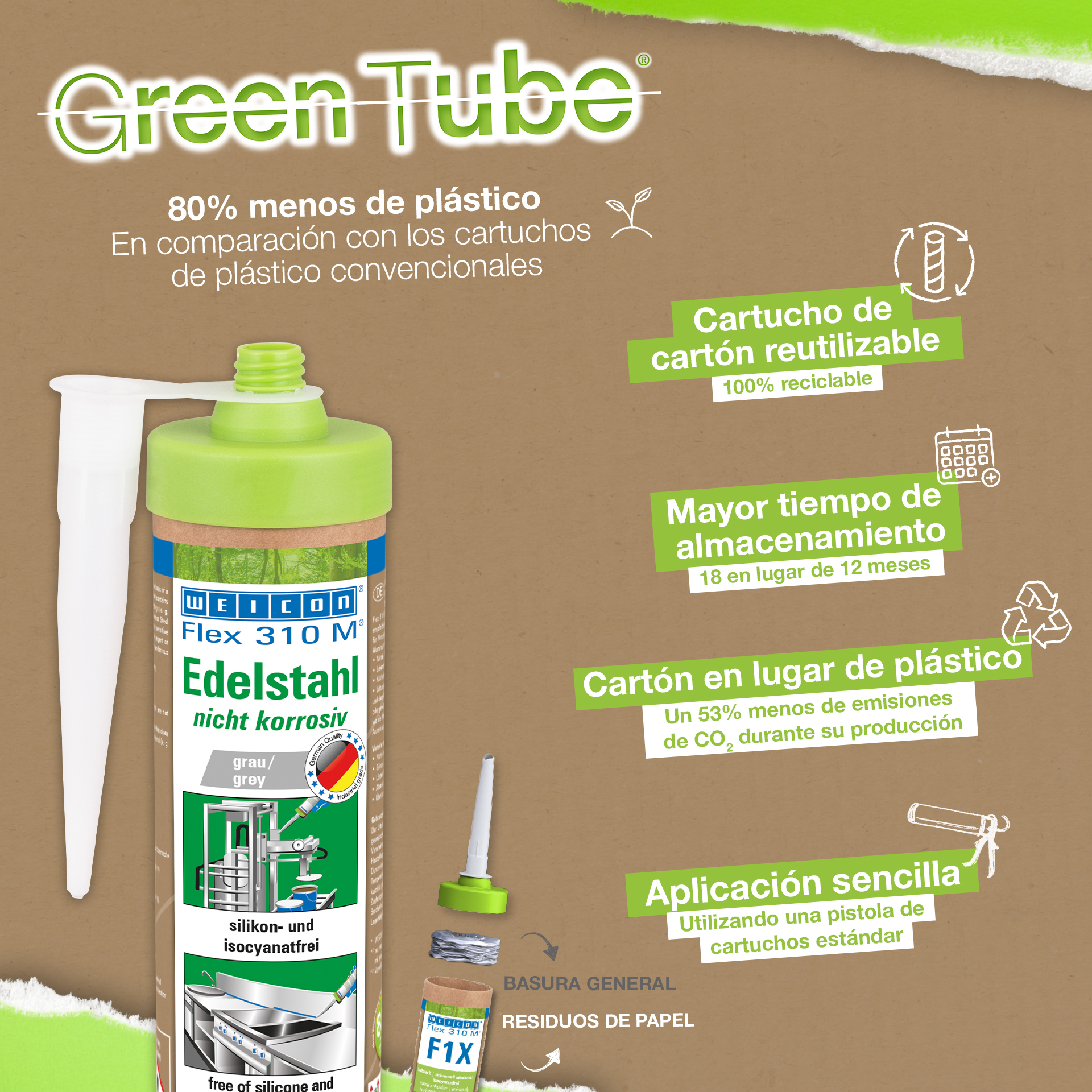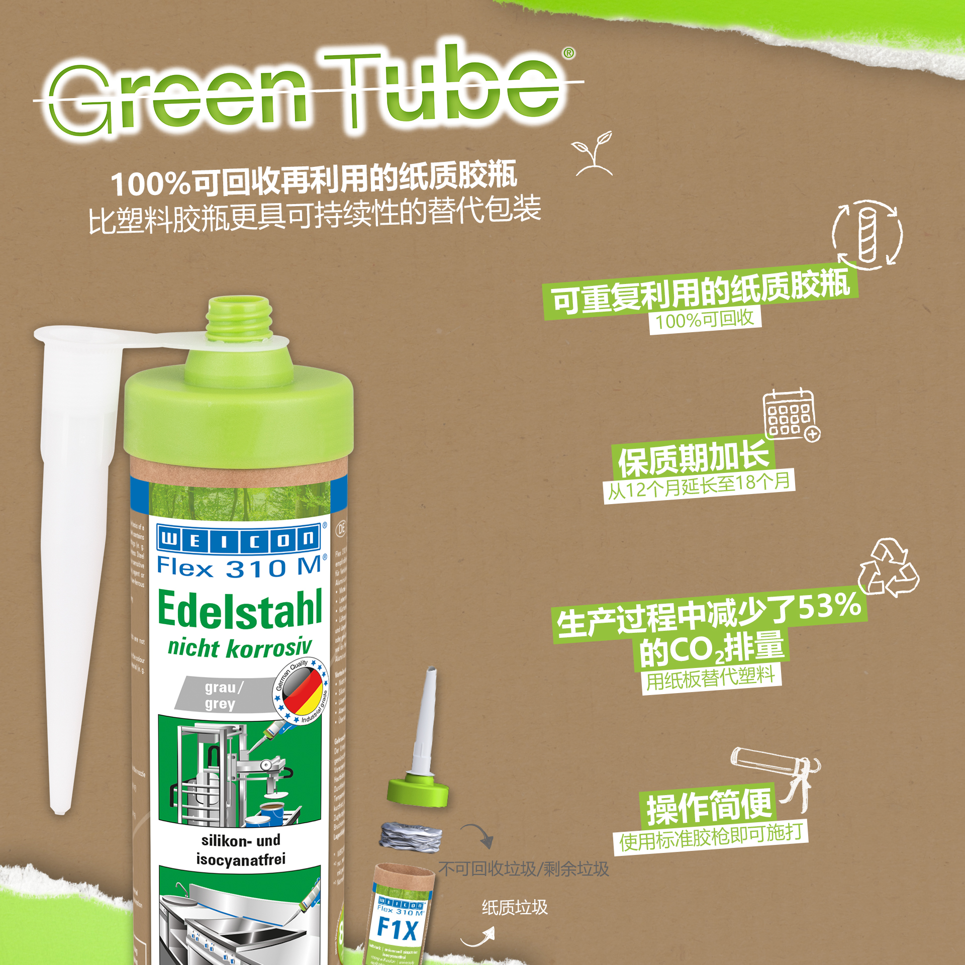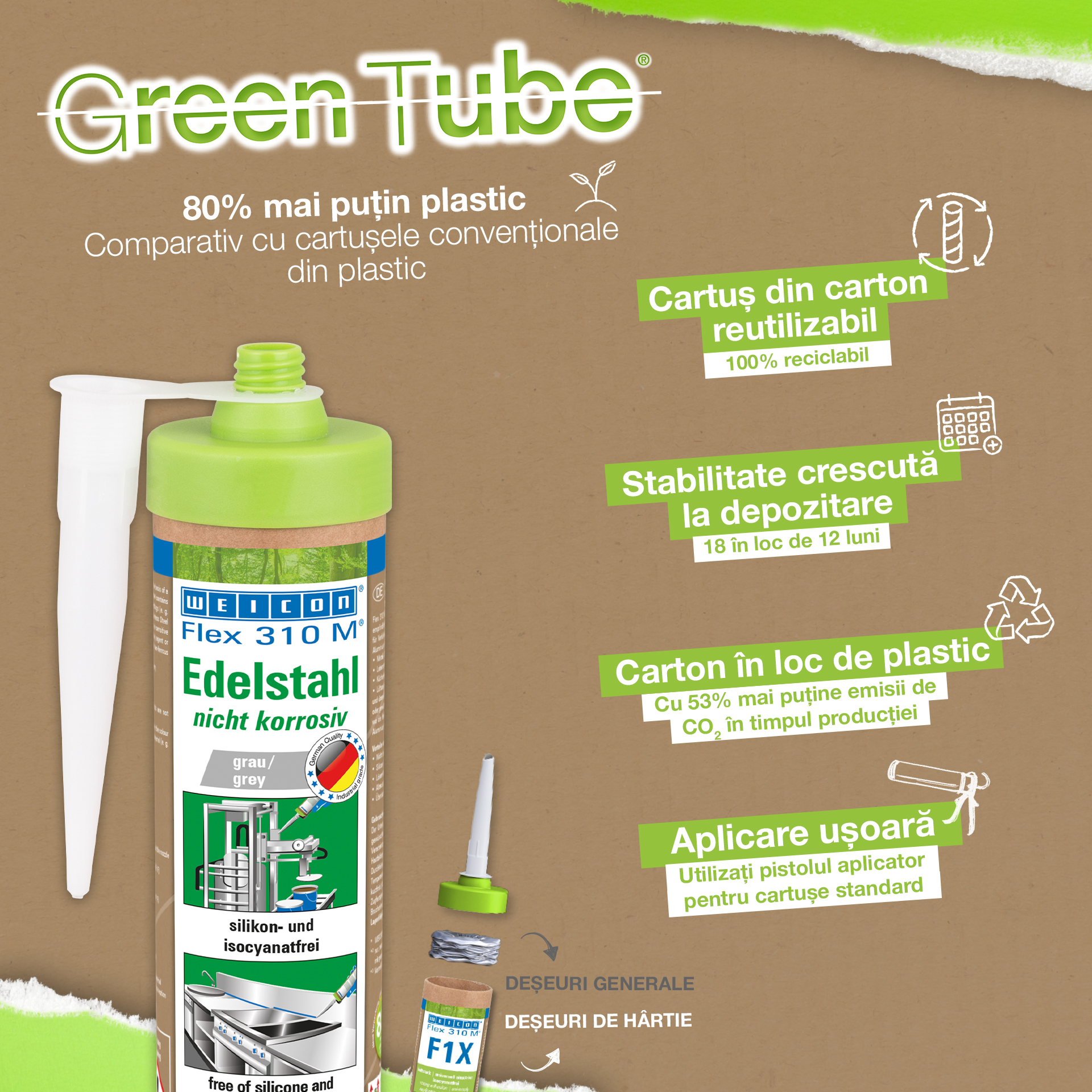 Der Kleb- und Dichtstoff WEICON Flex 310 M Edelstahl ist haftstark, „nass in nass“ überlackierbar, schleiffähig, alterungsbeständig, UV-stabil und ist silikon-, isocyanat-, halogen- und lösemittelfrei und nicht korrosiv. Das Produkt ist ISEGA zertifiziert und kann als Klebstoff in der Lebensmitteltechnologie verwendet werden. Flex 310 M Edelstahl ist ein elastischer Klebstoff auf MS-Polymer-Basis und eignet sich für Verklebungen sowie Naht- und Fugenabdichtungen an Metallen, wie Edelstahl, Aluminium und Buntmetallen. Es wird darüber hinaus auch überall dort eingesetzt, wo die Farbe des Dicht- und Klebstoffes dem Material (z.B. Edelstahl, Aluminium, etc.) angepasst sein soll. WEICON Flex 310 M Edelstahl kann im Metallbau, im Behälter- und Apparatebau, in der Lebensmittelindustrie, im Küchenbau und Sanitärbereich, in der Lüftungs- und Klimatechnik und überall dort, wo Silikone bzw. silikonhaltige Produkte nicht geeignet sind, zum Einsatz kommen.