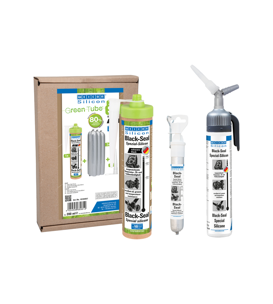WEICON Black-Seal a une haute résistance thermique (+280 °C/+536 °F). Sans solvant, fortement adhésif, résistant à la pression et au vieillissement, il est extrêmement élastique (allongement à la rupture d'env. 500%). Black-Seal convient pour les collages et les étanchements nécessitant une résistance particulièrement forte à l'égard des huiles et des graisses. WEICON Black-Seal s'utilise sur les couvercles de boîtes à vitesses, de soupapes et de boîtiers, sur des carters et des pompes à huile, pompes à eau, boîtes à vitesses et essieux, flasques, réservoirs et récipients et dans beaucoup d'autres domaines.