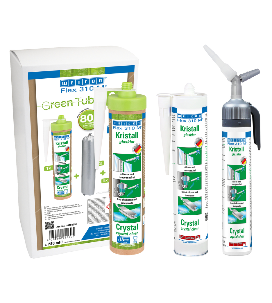 WEICON Flex 310 M Cristal est transparent, fortement adhésif, peut être peint «mouillé sur mouillé» et poncé. Il possède une excellente résistance au vieillissement, une bonne stabilité aux UV, il est résistant à l'eau douce et à l'eau salée, exempt de silicone, d'isocyanate, d'halogènes et de solvants. Il est certifié ISEGA et s'utilise comme adhésif en technologie alimentaire. Flex 310 M Cristal est un adhésif élastique à base de Polymères MS et convient pour assembler le verre, le PC*, le PMMA* et le verre acrylique*, les métaux, de nombreuses matières plastiques, la céramique, le bois et la pierre. Une fois durci, le produit est limpide et convient particulièrement pour les assemblages élastiques où l'adhésif peut ou doit rester invisible. Il s'utilise dans la transformation des matières plastiques, la construction métallique, la chaudronnerie, la construction d'appareils, la ventilation et la climatisation, l'industrie électrique et des luminaires, la construction de stands d'exposition et l'agencement de magasins et partout où les silicones ou les produits siliconés sont inappropriés. (* = Coller seulement sans tension)