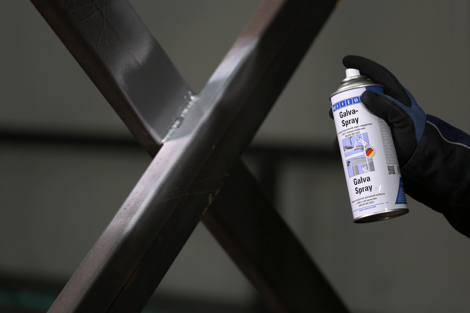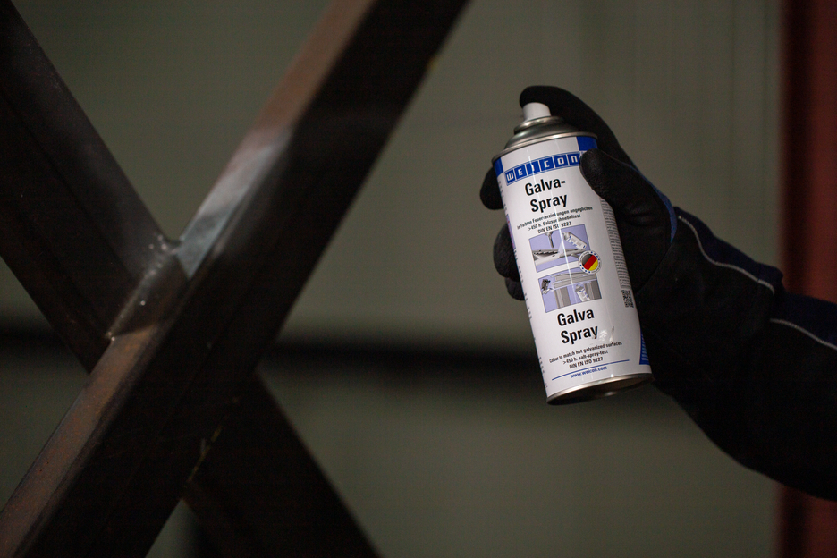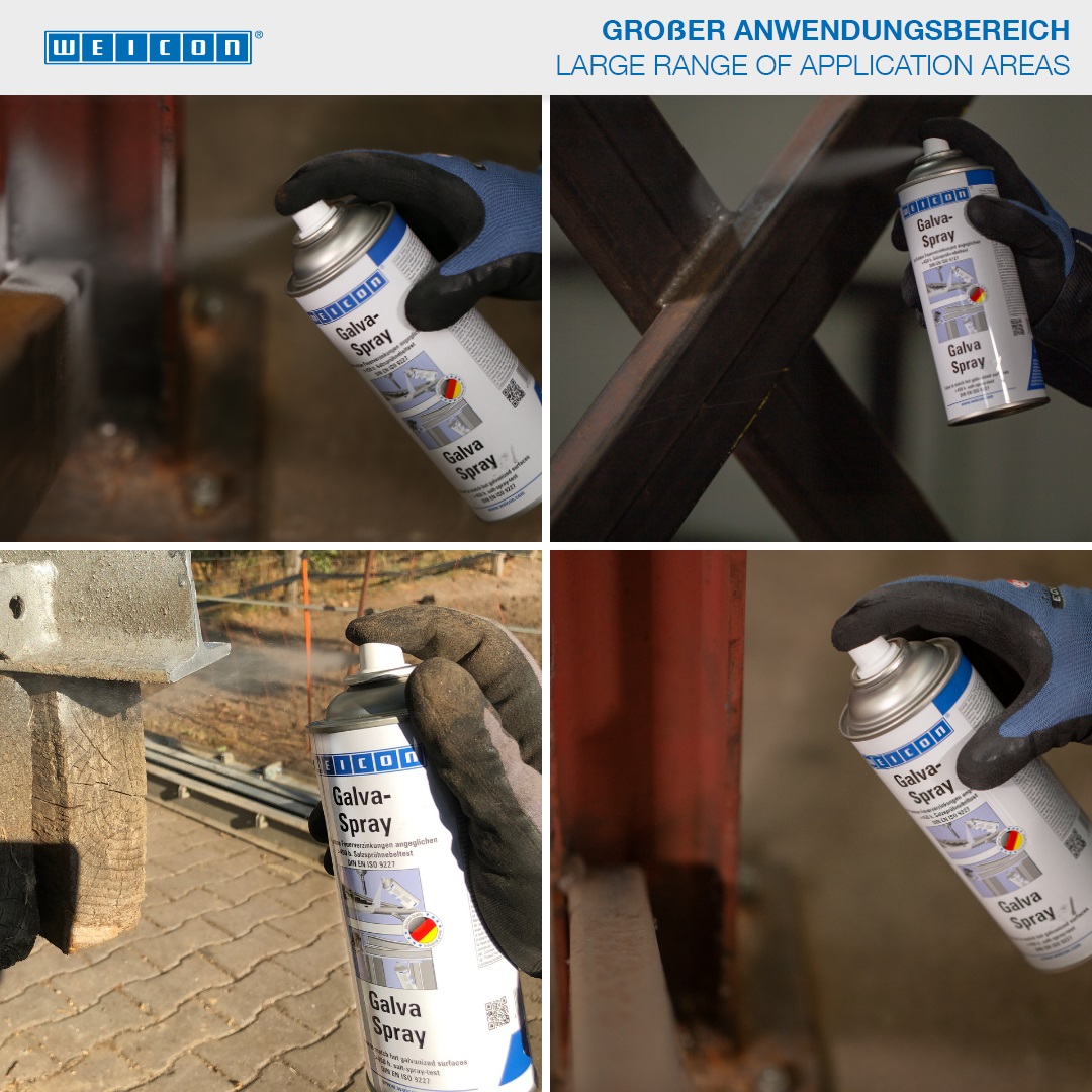 Le Galva-Spray WEICON sert de couche de protection durable pour toutes les surfaces métalliques. Il protège les métaux de la rouille et de la corrosion, sèche rapidement et adhère fermement. Le spray résiste à l'eau salée et à l'eau douce ainsi qu'aux températures jusqu'à +300°C (+572°F) env. Des pièces métalliques revêtues de Galva-Spray ne présentaient aucune corrosion même après plus de 450 heures d’exposition au brouillard salin selon DIN EN ISO 9227. Le spray sert aux reprises, dans un ton harmonisé, de zingages au feu endommagés. Il sert d'apprêt antirouille de grande qualité par exemple pour des vernis de carrosserie, pour enduire des cordons de soudure et des alésages et comme couche intermédiaire conductrice dans le soudage par points.