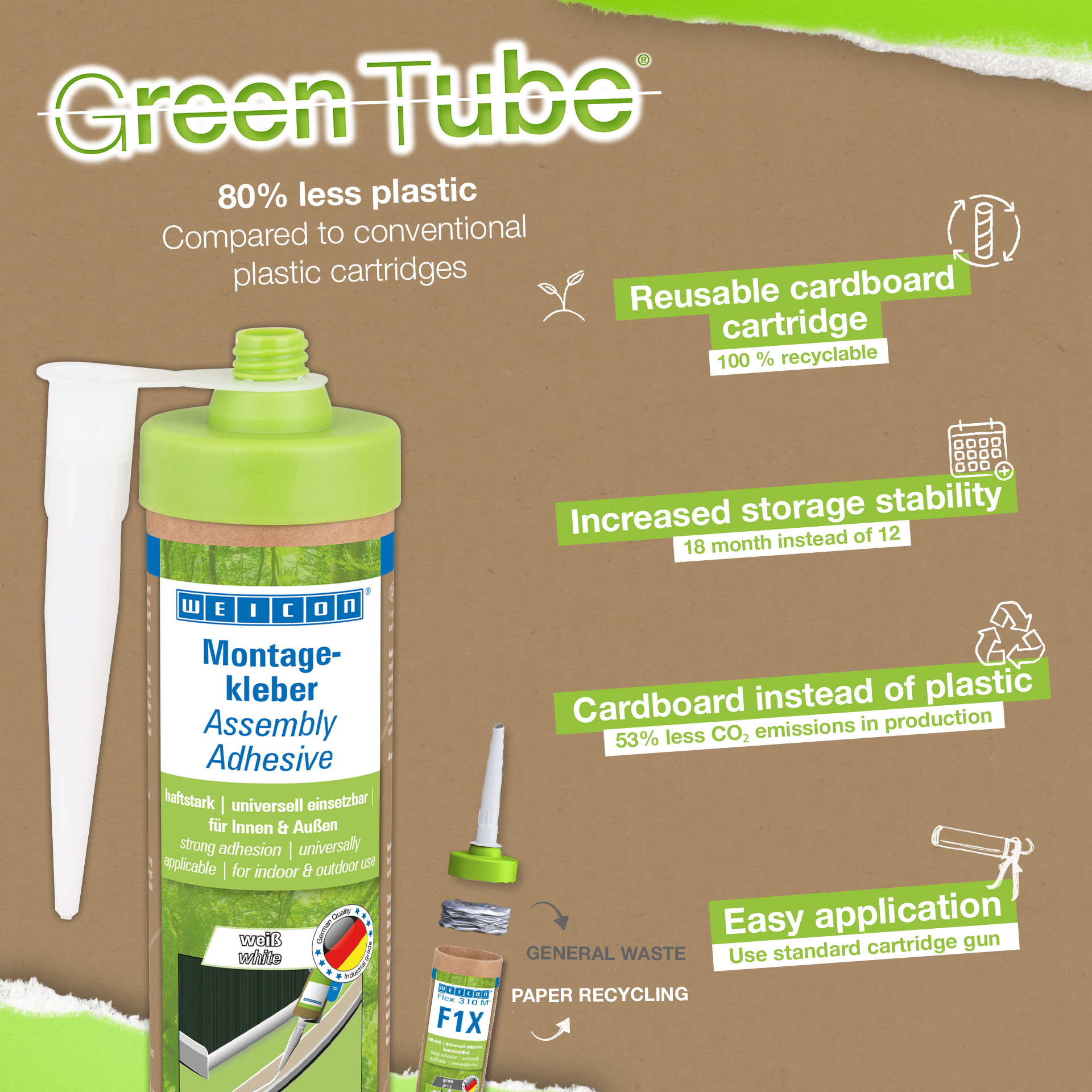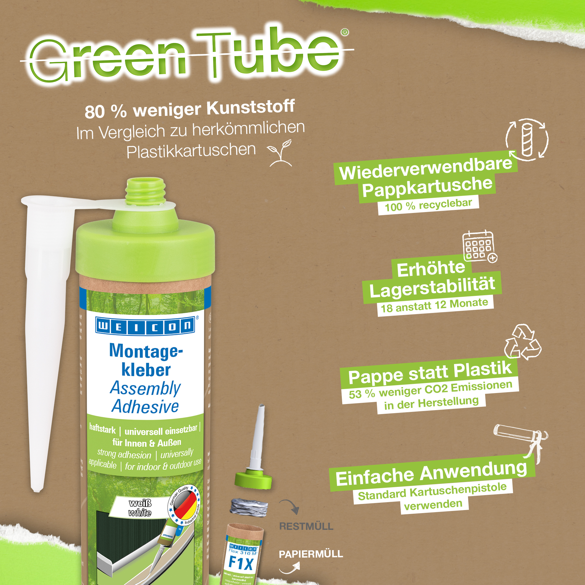 La Colle de Montage WEICON est une colle acrylique à dispersion à forte adhérence pour les travaux de montage, de réparation et de retouche. La colle dispose d'une adhérence initiale et d'une résistance finale élevées et durcit rapidement. Après séchage, la colle de montage peut être poncée et recouverte d'un enduit et peut être peinte avec des peintures et des vernis courants. La colle résiste à des températures comprises entre -20 °C et +80 °C et convient aussi bien aux applications intérieures qu'extérieures. La colle blanche flexible est à faible émission et exempte de solvants. La Colle de Montage est universelle et peut être utilisée pour les applications les plus diverses. Elle est par exemple idéale pour le collage en surface de matériaux en bois, (comme les plinthes, les moulures, les panneaux ou les panneaux de particules), le PVC, le polystyrène expansé, la mousse rigide PU (par exemple les panneaux isolants et les gaines de câbles), les matériaux minéraux (par exemple le carrelage) et les métaux sur des supports absorbants, comme le crépi, le béton, le fibrociment, le placoplâtre et le bois non traité. Emballage durable - même efficacité ! Green Tube, l'emballage durable : l'embout et le couvercle sont composés à 100 % de plastique recyclé, le corps de la cartouche à 100 % de carton. Moins d'émissions de CO2 et de consommation de plastique que les cartouches traditionnelles. Sans faire de compromis sur les performances !