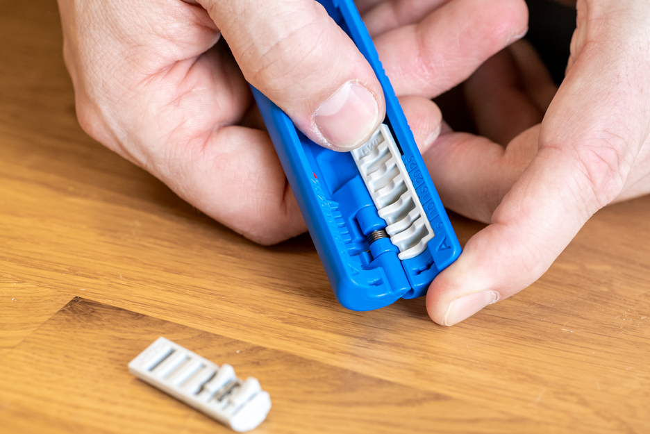 The stripping tool Fibre Optic Tube No. 2 has been specially designed for quick access to the optical fibres in loose tubes in buffer tubes from 1.2 mm to 4 mm diameter. It is suitable for a wall thickness of 0.15 mm to 0.6 mm. With the knife in the module and a special insertion point, the buffer tube can be conveniently put through the handy tool. This gives the user fast and process-safe access to the optical fibre in no time at all. The knife in the stripping tool easily cuts the buffer tube (e.g. made of PE) and the user can simply bend the tube without damaging the sensitive glass fibre. If necessary, the insertion point and the knife in the half-shells can be replaced or renewed as modules.