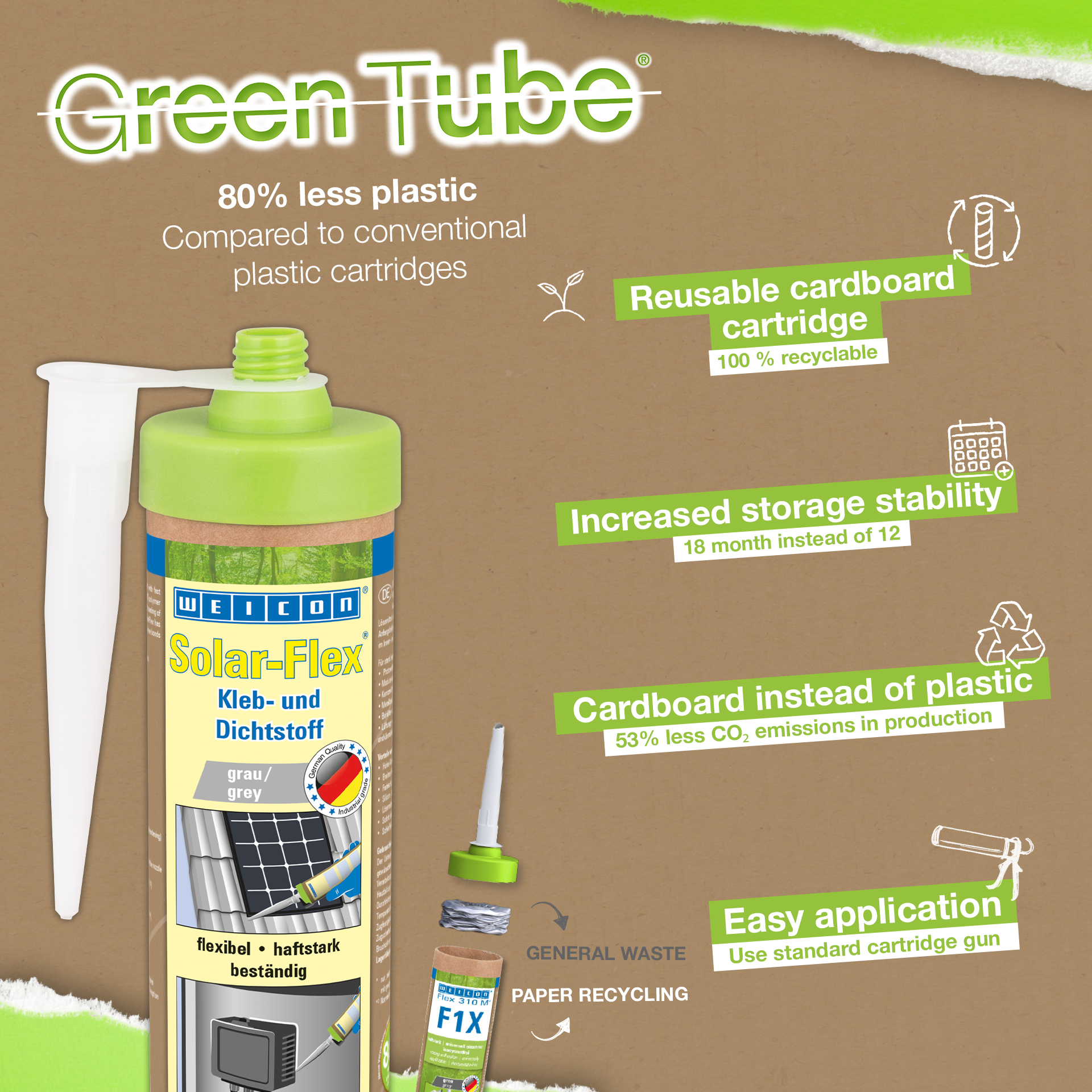 WEICON Solar-Flex possède un fort pouvoir adhésif, est non corrosif, peut être peint «mouillé sur mouillé», résiste aux intempéries et aux UV et est exempt de silicones, d‘isocyanates, d‘halogènes et de solvants. Solar-Flex est un adhésif élastique à base de polymères MS, spécialement conçu pour l’industrie solaire. L’adhérence initiale très élevée et la rapide montée en force de l’adhésivité permettent de coller même sur des surfaces verticales. Remplace les méthodes traditionnelles de fixation dans l‘assemblage d’installations solaires et photovoltaïques.