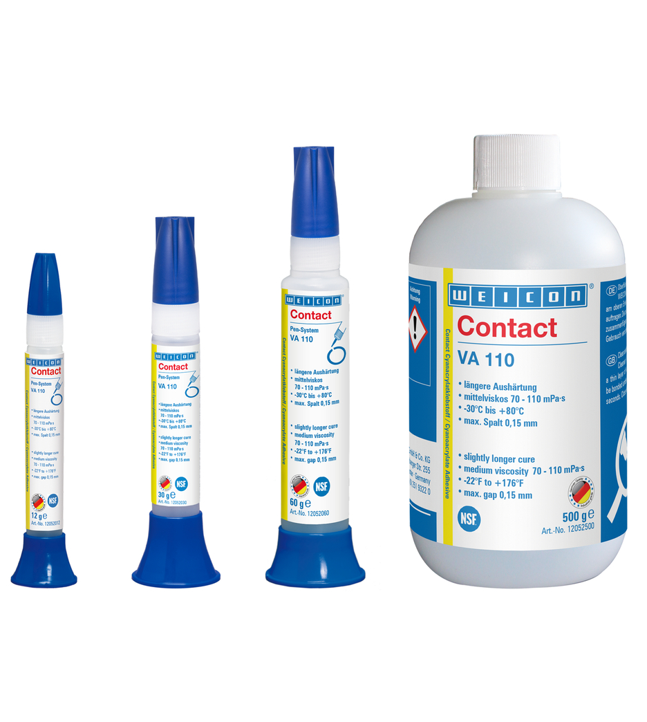 WEICON VA 110 est un adhésif cyanoacrylate de type universel avec certificat NSF, qui est idéal pour l’utilisation dans des secteurs sensibles, comme le secteur alimentaire et de l’eau potable, la pharmacie ou la production de jouets.