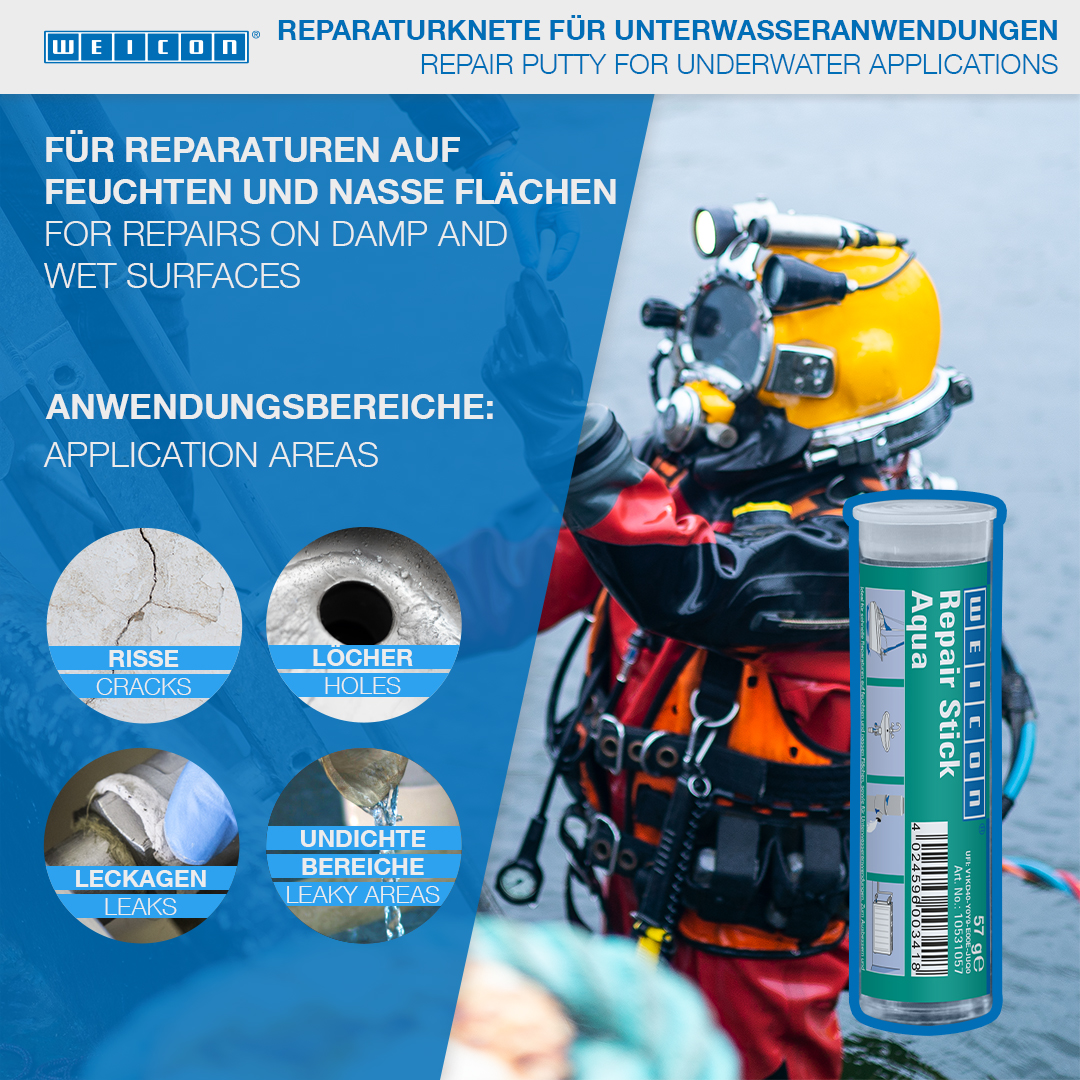 Ideale per riparazioni veloci su superfici umide o bagnate e applicazioni sott’acqua. Utilizzabile per riparare e sigillare crepe, buchi, perdite e permeabilità su serbatoi di benzina e acqua, termosifoni, quadri elettrici, impianti sanitari e piscine. WEICON Barretta acqua trova utilizzo nella costruzione di impianti sanitari e di riscaldamento, settore elettrico, marittimo e in tanti altri settori industriali.