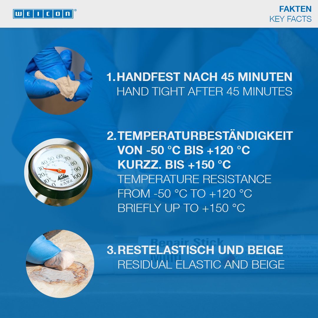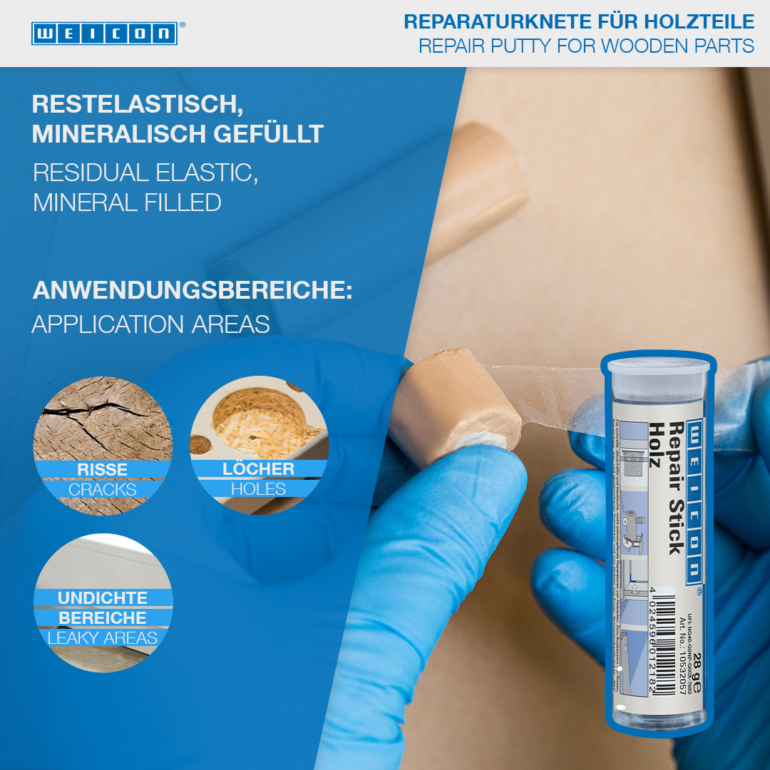 Per la riparazione durevole e con elasticità residua, non restringente di parti in legno. Idoneo per la riparazione di crepe, perforazioni, pezzi di legno rotti o spezzati e per la sigillazione di fughe su telai di finestre o intelaiature di porte, impiallacciature, assi e impalcature, modelli e giocattoli in legno. WEICON Barretta legno trova utilizzo nell’industria del legno e del mobile, nella costruzione di modelli e in tanti altri settori.