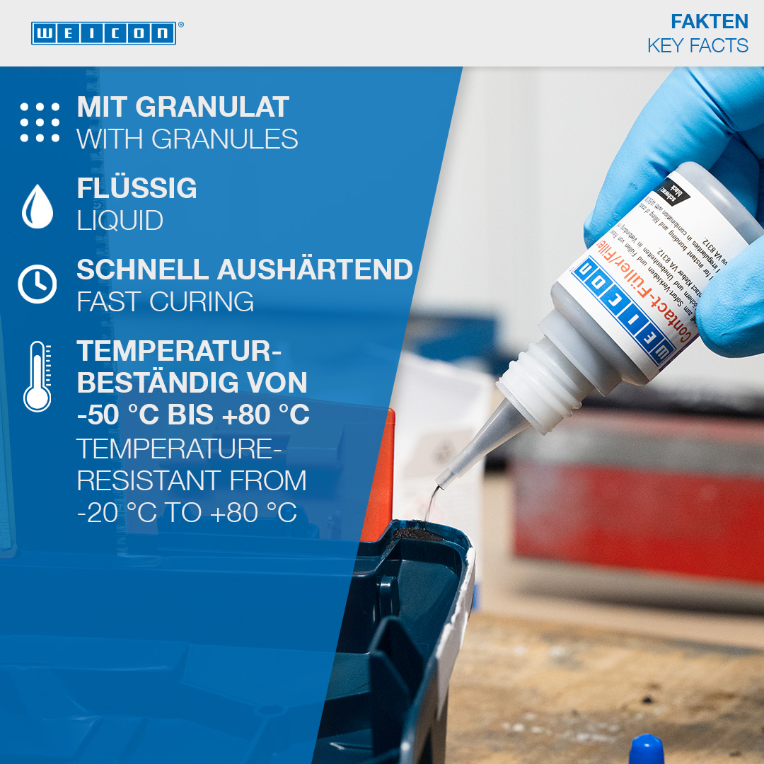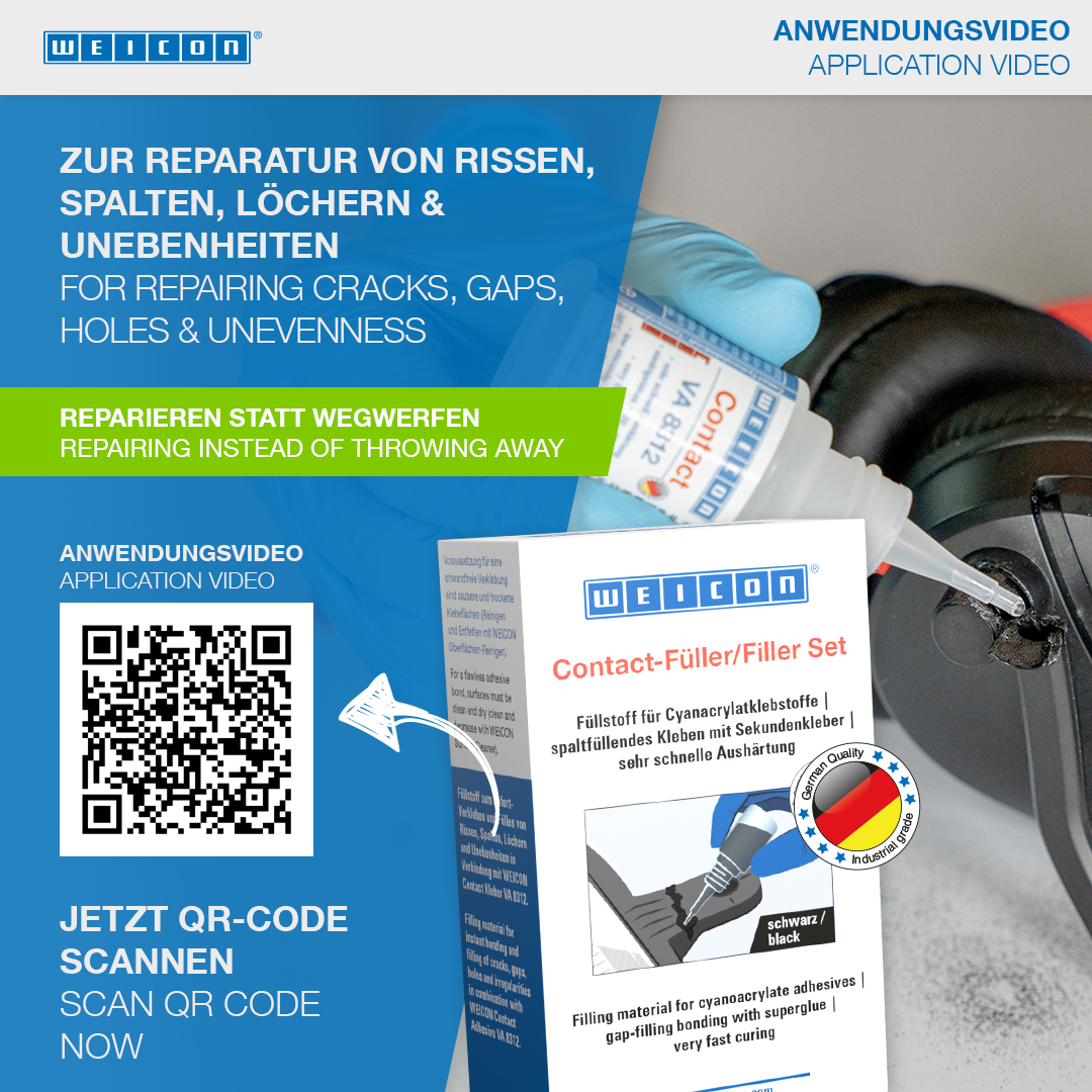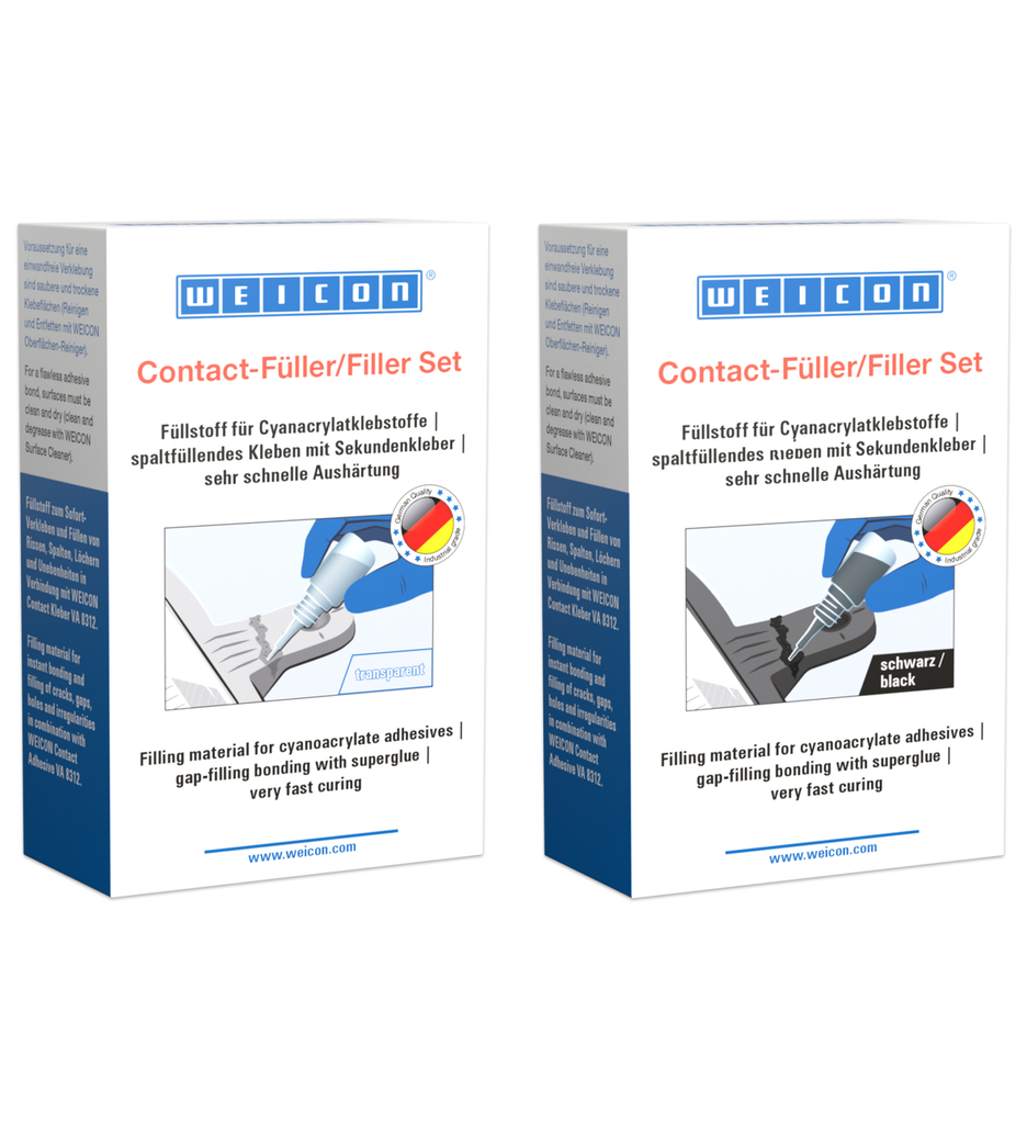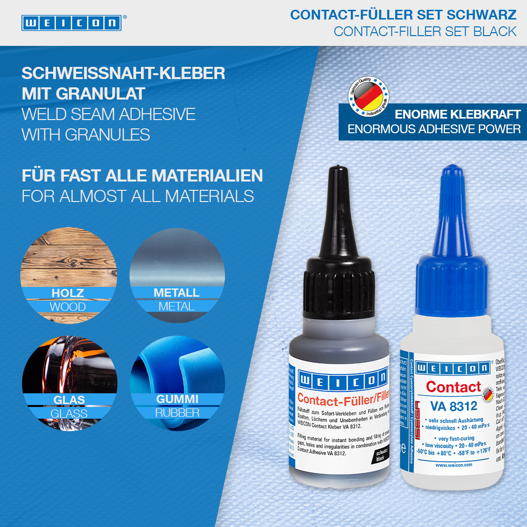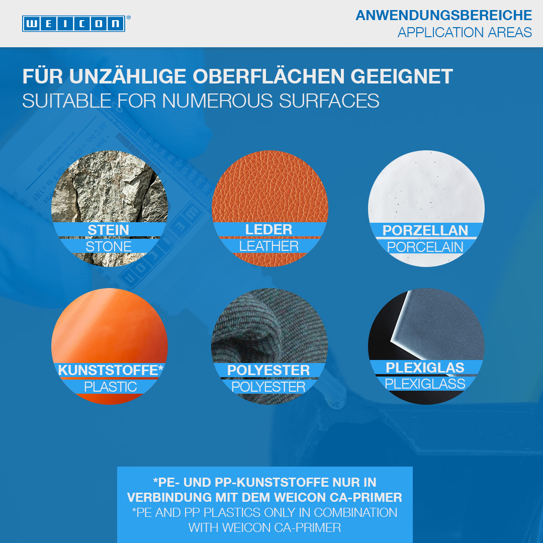 WEICON Contact VA 8312 è adatto per incollaggi su diversi tipi di gomma, come gomma piena o gommapiuma, plastiche ed elastomeri EPDM. Utilizzandola in combinazione con WEICON CA-Primer la colla WEICON Contact VA8312 è adatta anche per incollaggi su poliolefine (polietilene (PE), polipropilene (PP)). In combinazione con WEICON Contact Filler*, WEICON Contact VA 8312 è ideale per incollaggio istantaneo e riempimento di crepe, fessure, vuoti, fori ed aplanarità.