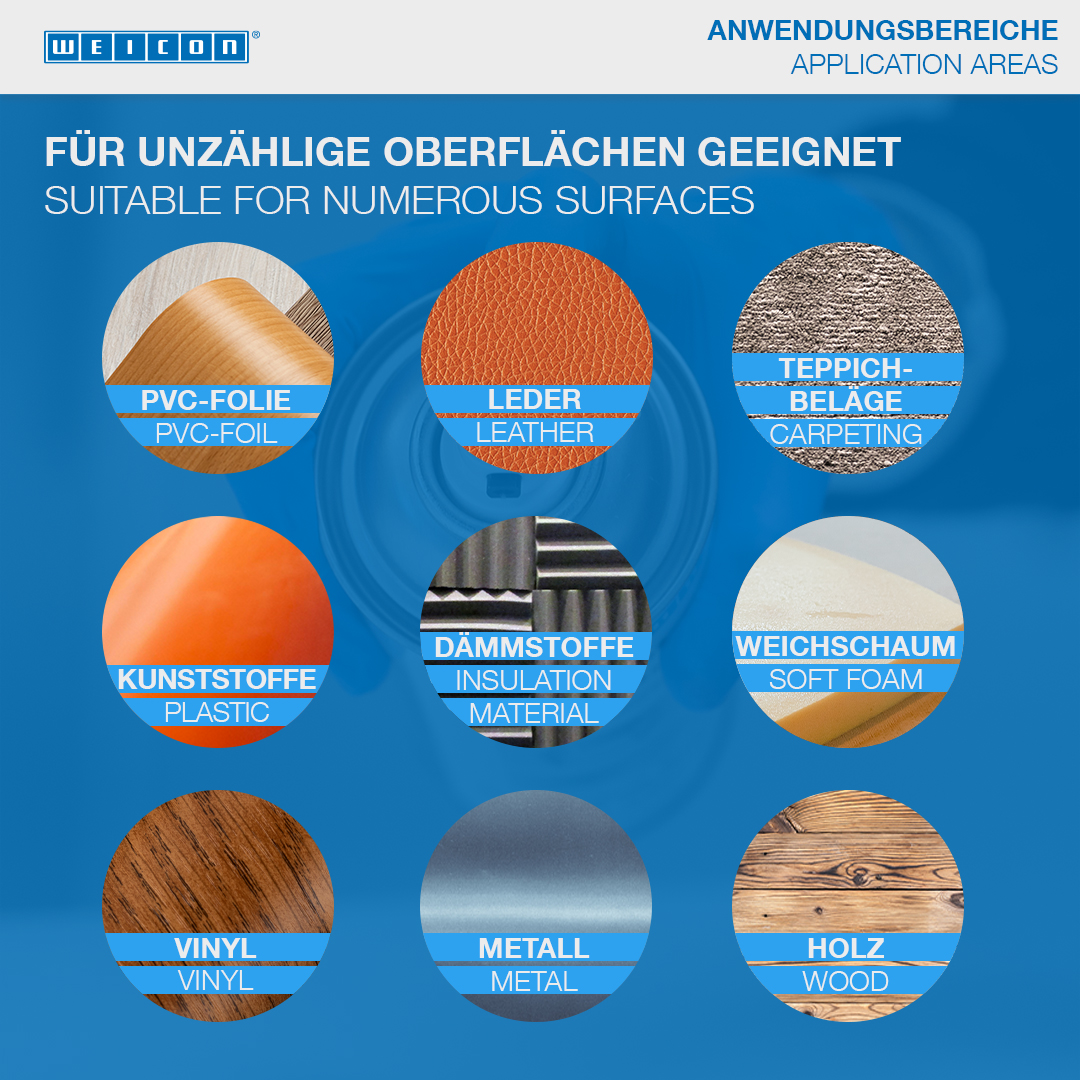 WEICON Colla Spray extraforte è un adesivo speciale per incollaggi forti e durevoli su superfici ruvide e non piane. WEICON Colla Spray extraforte è idonea per incollare feltro, PVC, pelle sintetica, tappeti, plastiche, carta, gomma schiuma e piuma, materiali insonorizzanti, vinile, cuoio, gomma, metalli e legno ed è idoneo anche per applicazioni su superfici molto estese.