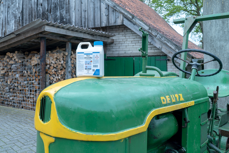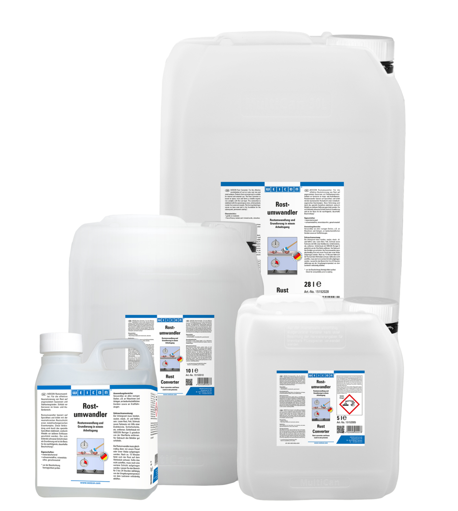 Il convertitore di ruggine WEICON viene utilizzato per neutralizzare la ruggine su substrati di ferro e acciaio arrugginiti e blocca in modo affidabile il processo di corrosione. Il convertitore di ruggine penetra nella ruggine grazie alla speciale formula di acido e tannino. In un processo chimico, converte gli ossidi di ferro in uno strato stabile e lascia anche una protezione temporanea dalla corrosione attraverso il fosfato di zinco. A seconda del contenuto di carbonio del metallo, la superficie trattata cambia colore, passando dal bluastro al bruno al nero. Lo strato costituisce la base ideale per i successivi rivestimenti protettivi, come lo Spray Zinco WEICON. Il Convertitore di ruggine WEICON ottiene risultati ottimali su superfici leggermente arrugginite con un grado di ruggine A e B. La ruggine e le parti allentate devono essere preventivamente rimosse meccanicamente. Il convertitore si attiva solo quando viene applicato sulla ruggine o sul metallo e può essere utilizzato su ampie superfici su tutti i punti arrugginiti, ad esempio su macchinari e attrezzature, macchine agricole e veicoli a motore. A differenza di altri convertitori, il Convertitore di Ruggine WEICON si rimuove dalla superficie trattata con acqua pulita e una spugna o una spazzola morbida una volta trascorso il tempo di reazione. Serve a rimuovere i materiali residui che si sono formati durante il processo di conversione.
