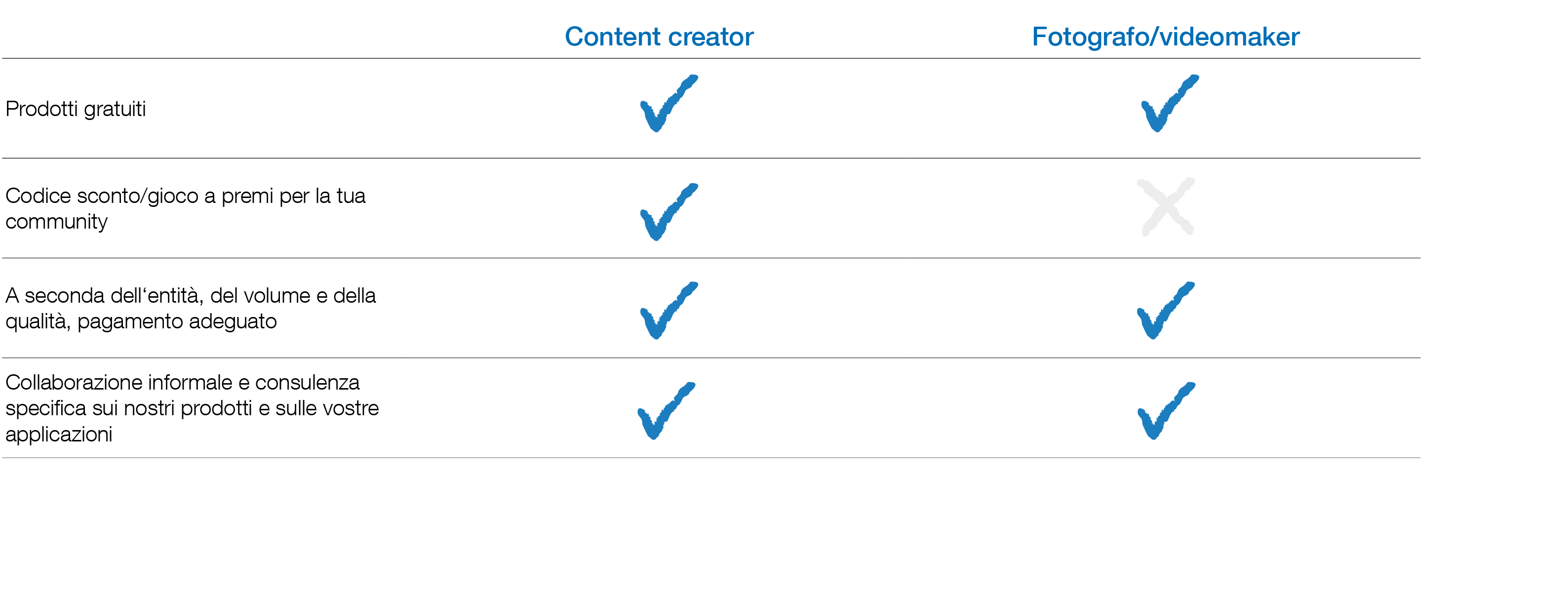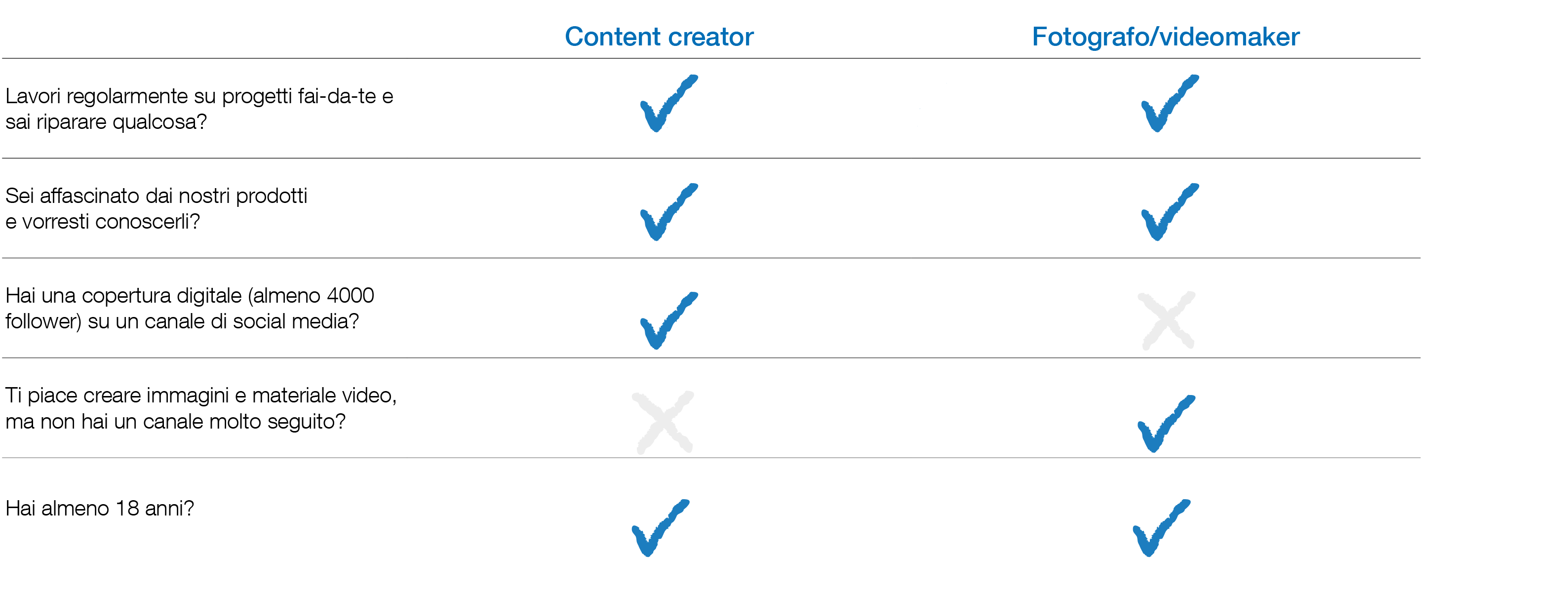 Siamo sempre alla ricerca di nuovi partner che possano utilizzare e presentare i nostri prodotti nei loro progetti o creare contenuti accattivanti che possiamo utilizzare. Abbiamo nel nostro portfolio prodotti relativi alle installazioni elettriche, per le officine, per la conversione di camper o di fattorie, in modo da aiutarti a realizzare con successo il tuo progetto. Scopri se sei adatto a noi come creatore di contenuti o fotografo/videomaker. Se desideri entrare a far parte del nostro team di creators, riempi semplicemente il modulo sottostante: forse sei proprio tu la persona che stiamo cercando!