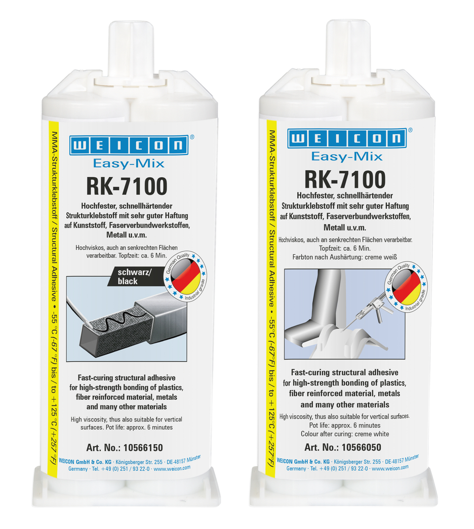 La colla strutturale acrilica WEICON ERK-7100 incolla con un’alta resistenza alla trazione, al taglio e all’urto tanti tipi di materiali come plastiche, metalli o ceramica, anche fra di loro. È particolarmente adatto per incollaggi strutturali, dove sia richiesto un incollaggio ad alta resistenza. Il collante è molto viscoso ed è quindi adatto anche per lavorazioni su superfici verticali. RK-7100 è applicabile universalmente e trova utilizzo per es. nella tecnologia delle plastiche, nella lavorazione di metalli, nella costruzione di veicoli e carrozzerie, nella produzione di macchinari, nell’elettrotecnica, nella lavorazione del legno o nella costruzione di espositori e stand fieristici. Per la lavorazione di prodotti Easy-Mix in 50 ml è necessario utilizzare il Dosatore manuale Easy-Mix D 50.