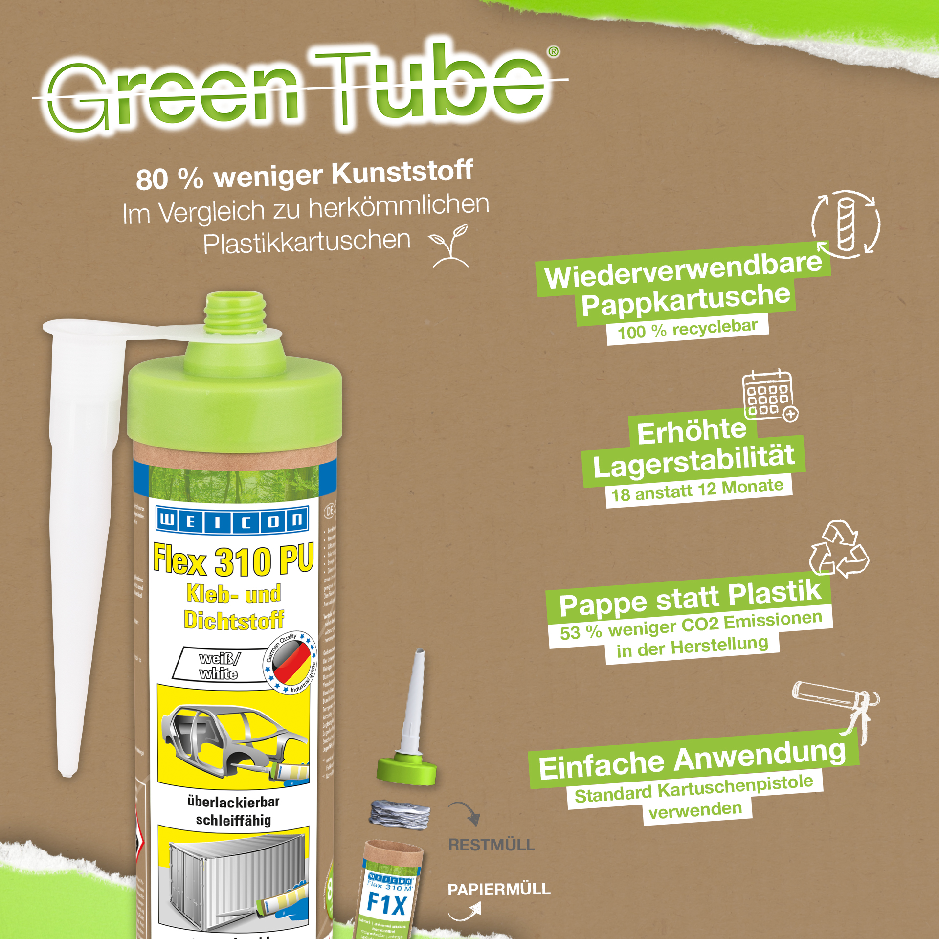 WEICON Flex 310 M Acciaio INOSSIDABILE non è corrosivo, possiede un’ottima qualità di adesione, è verniciabile bagnato su bagnato, levigabile, resistente agli agenti atmosferici e ai raggi UV ed esente da siliconi, isocianati, alogeni e solventi. Il prodotto è certificato ISEGA e può essere utilizzato nell’industria alimentare. Flex 310 M Acciaio INOSSIDABILE è un collante elastico a base di polimeri MS ed è ideale per incollaggi e sigillature su metalli come acciaio inossidabile, alluminio e metalli non ferrosi. Trova applicazione laddove il sigillante o il collante devono avere lo stesso colore del materiale (p. es. acciaio inox, alluminio). WEICON Flex 310 M Acciaio inossidabile è adatto per applicazioni nel settore del metallo, nella costruzione di serbatoi e apparecchiature, nell’industria alimentare, per la costruzione di cucine, nel settore di impianti sanitari, impianti di ventilazione e condizionatori e dove l’utilizzo di siliconi o prodotti contenenti siliconi non è gradito.