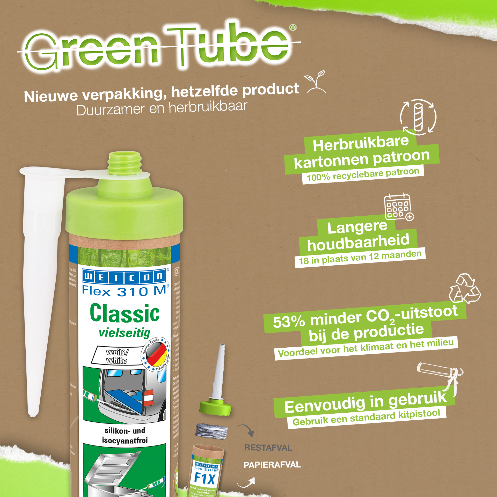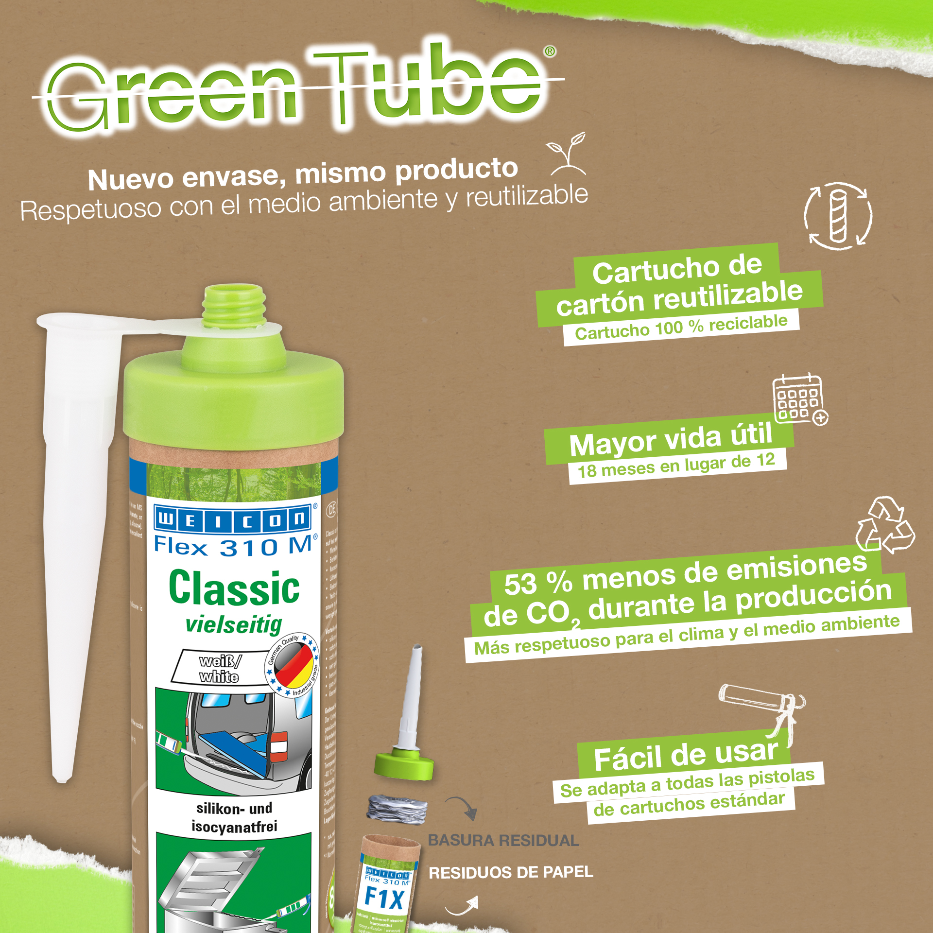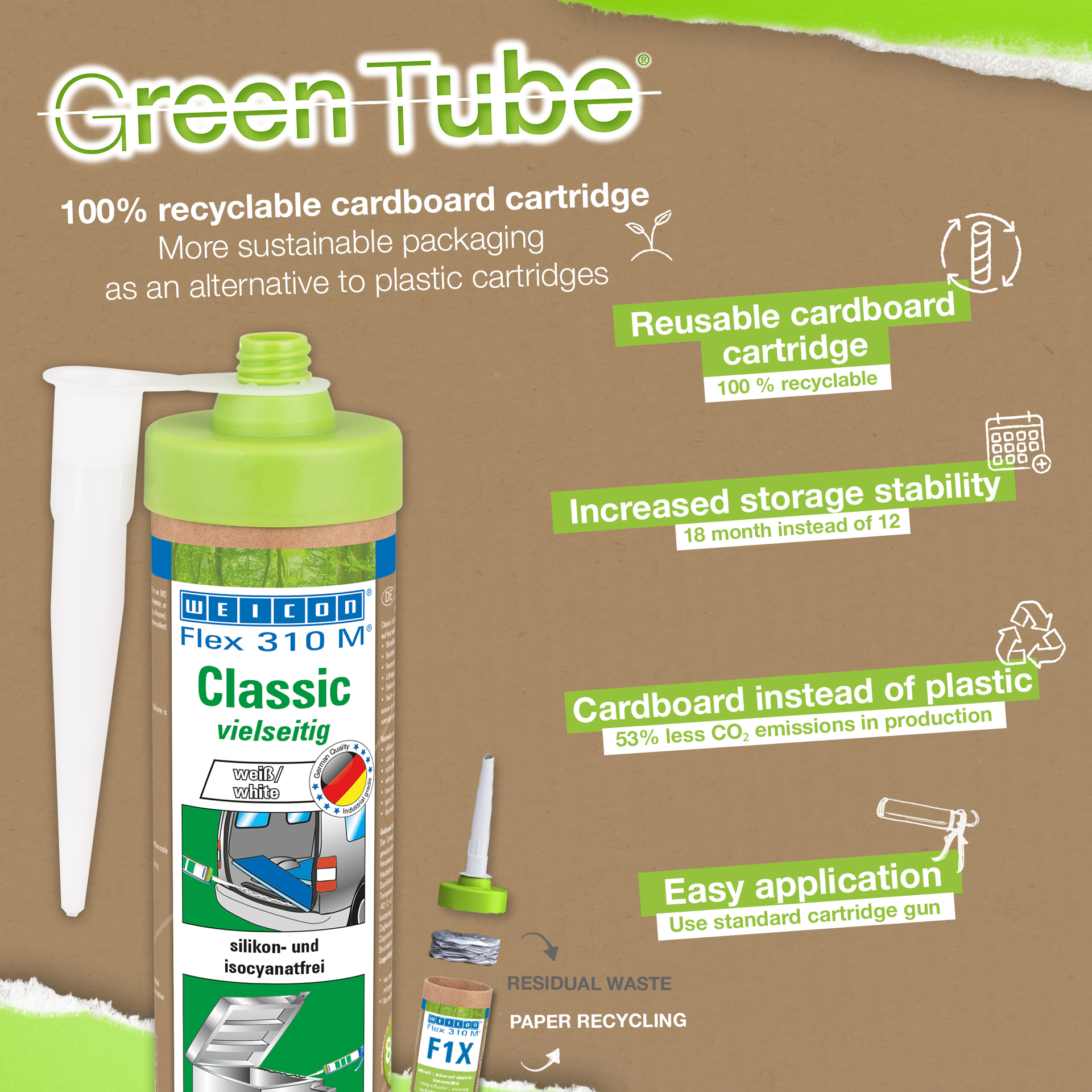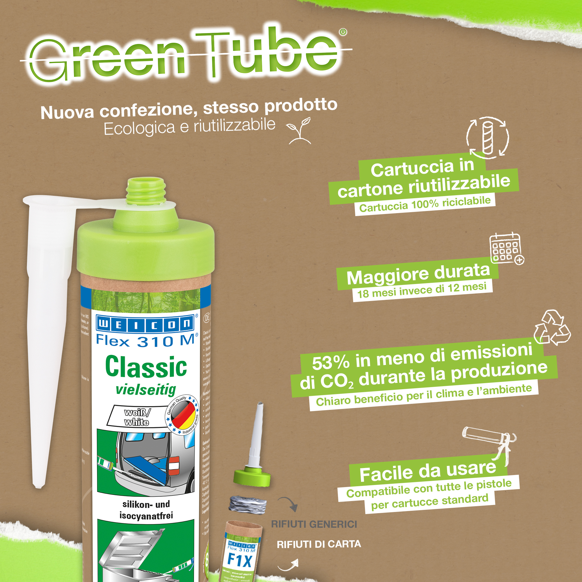 WEICON Flex 310 M® Classico possiede un’elevata qualità aderente, è verniciabile bagnato su bagnato, levigabile, possiede un’ottima resistenza all’invecchiamento e una buona stabilità all’esposizione a raggi UV. È resistente contro l’acqua dolce e salmastra ed esente da siliconi, isocianati, alogeni e solventi. WEICON Flex 310 M® Classico è certificato ISEGA e può essere utilizzato come collante nell’industria alimentare. Flex 310 M® Classico è un collante elastico a base di Polimeri MS ed è adatto per incollaggi su metallo, tanti tipi di plastiche, ceramica, legno, vetro e pietra. Il collante e sigillante trova utilizzo nel settore delle costruzioni metalliche, costruzione di contenitori e apparecchiature, costruzione di carrozzerie, veicoli e container, impianti di ventilazione e condizionatori, nell’industria elettronica, nel settore nautico e laddove l’uso di siliconi o prodotti contenenti silicone non è desiderato.