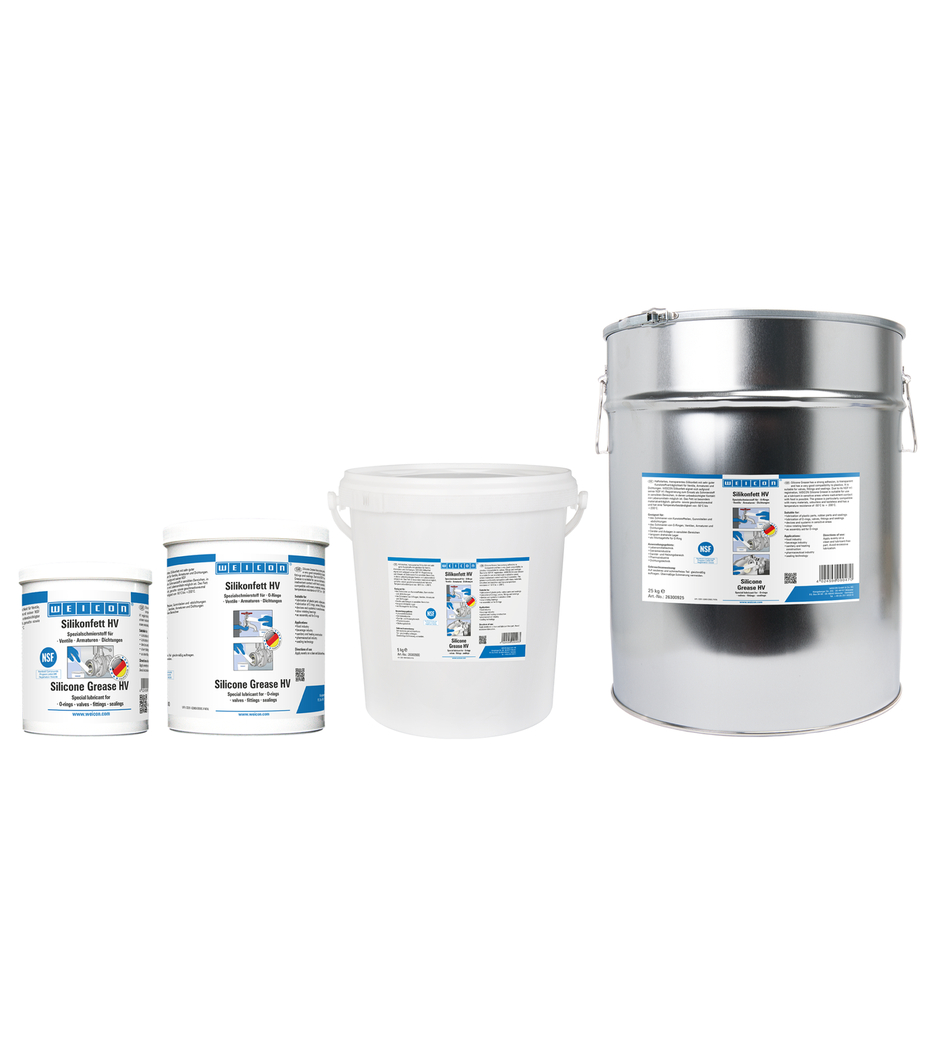 WEICON Grasso Siliconico HV è trasparente, altamente aderente e possiede una eccellente compatibilità con la plastica. Grazie alla registrazione NSF H1, il grasso siliconico WEICON è adatto come lubrificante per valvole, armature e guarnizioni in aree sensibili. Conforme alle linee guida KTW dell'ufficio federale tedesco dell'ambiente per il contatto con l'acqua potabile Può essere utilizzato nell’industria alimentare e delle bevande, nel settore sanitario e del riscaldamento, nell’industria farmaceutica e nella tecnologia delle guarnizioni. WEICON Grasso Siliconico HV è approvato BAM e valutato in materia di sicurezza - vedi M 034-1 "Lista di materiali nonmetallici compatibili con l’ossigeno" (DUGV Information 213-075) del BG RCI. Il grasso è particolarmente compatibile con diversi materiali, inodore, insapore ed è termostabile da -50 °C fino a +200 °C. WEICON Grasso Siliconico HV è adatto per la lubrificazione di parti in plastica, in gomma e per chiusure in gomma, nonché per la lubrificazione di valvole, armature, guarnizioni, per apparecchiature ed impianti.