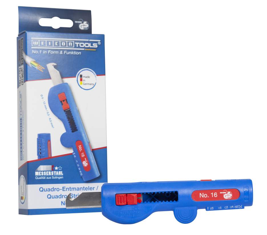 • taglio longitudinale e circolare sicuro nonché la sguainatura precisa anche in punti difficilmente accessibili su pareti e soffitti, scatole di derivazione e di distribuzione, quadri elettrici ecc. • impostazione della profondità di taglio non necessaria: l’utensile è ottimizzato per il lavoro con conduttori NYM ad esempio dai 3 x 1,5 mm² fino ai 5 x 2,5 mm² . • presa antiscivolo che consente un’alta maneggiabilità per il lavoro quotidiano • lavoro rapido e senza sforzi grazie all'innovativa disposizione delle lame per il taglio longitudinale • 100% Made in Germany • in poliammide rinforzato con fibra di vetro, resistente, ergonomico e molto maneggevole • Acciaio di Solingen per coltelli di alta qualità per lame molto longeve • testato TÜV/GS in materia di sicurezza sul lavoro Lo Sguainatore Quadro No. 16 è un utensile di nuovo sviluppo per utilizzatori professionali nell'industria e nell'artigianato. L'utensile 4 in 1 svolge diverse funzioni: taglio circolare - taglio longitudinale - sguainatura - taglio. È così possibile sostituire diversi utensili con uno solo. Ciò permette di risparmiare spazio nella cassetta degli attrezzi e sui costi. Il passaggio dei cavi integrato ottimamente nell'alloggiamento assicura una sguainatura sicura, precisa e confortevole di tutti i comuni cavi tondi e cavi a prova di umidità con un diametro di 8,0 - 13,0 mm. (p. es. NYM cavi coassiali 3 x 1,5 mm² fino a 5 x 2,5mm). Grazie alla forma del manico ergonomica l'utensile è particolarmente adatto da maneggiare. L'impugnatura salda assicura che lo Sguainatore Quadro No. 16 abbia una presa ottimale, sicura ed antiscivolo. Ciò semplifica il lavoro quotidiano e aumenta inoltre la sicurezza. Anche in punti difficilmente accessibili o in scatole di derivazione e di distribuzione, con l’utensile è possibile eseguire una spelatura e una sguainatura precisa dei cavi. Non è necessario regolare manualmente la profondità di taglio. Possono essere lavorati nei livelli di spelatura integrati tutti i più comuni conduttori flessibili e rigidi con sezione tra 0,5 e 6 mm² . Questo utensile universale dispone di una lama a gancio retrattile, bloccabile in qualsiasi posizione e facile da sostituire.