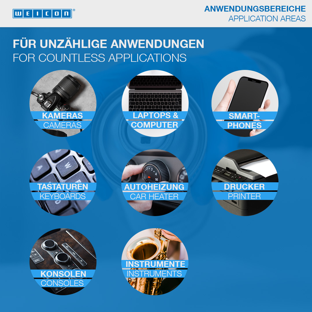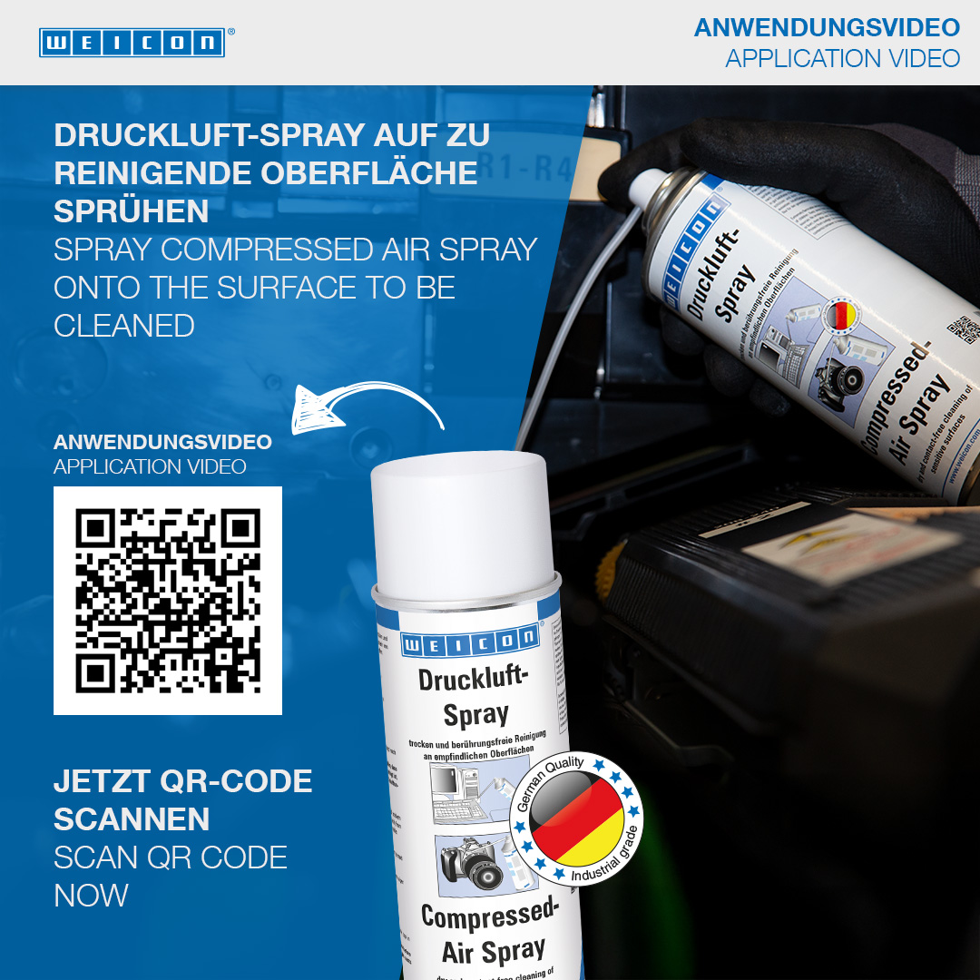 WEICON Spray Aria Compressa va usato quando la polvere non può essere rimossa in maniera tradizionale. Permette una pulizia a secco senza contatto, anche in angoli inaccessibili e su superfici delicate. WEICON Spray Aria Compressa trova utilizzo su videoregistratori e impianti HiFi (per esempio su moduli, circuiti stampati, testine magnetiche, lettori), nell’ottica (p. es. video- e fotocamere, obiettivi, lenti), su scatole di fusibili e tergicristalli, su meccanismi a molla (orologi al quarzo), per le attrezzature medicali, nel modellismo, su strumenti di misura, su componenti elettrici e su circuiti stampati.