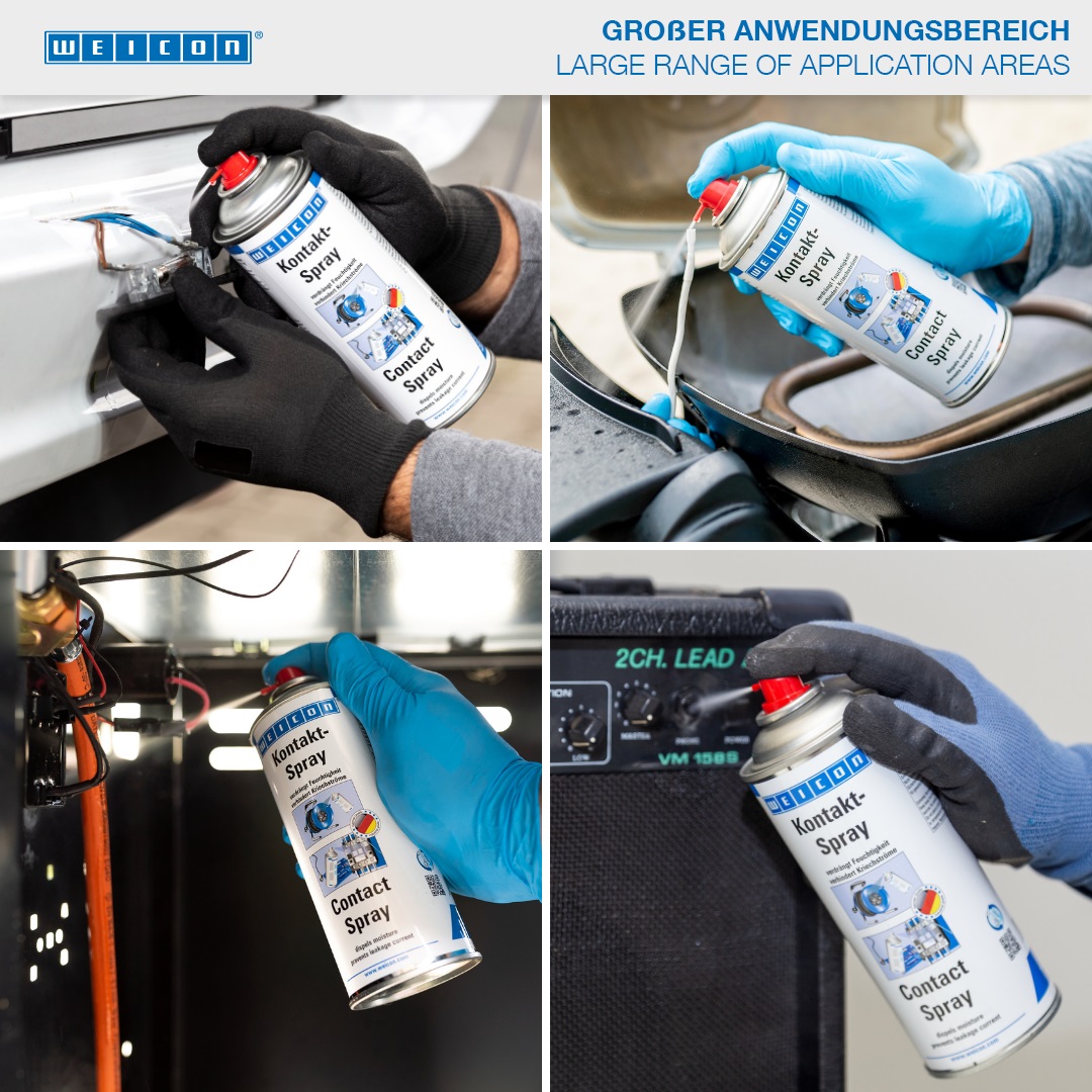 WEICON Spray Contact è a base di una combinazione particolare di sostanze attive per la cura e la protezione di contatti e componenti elettrici. Repelle umidità da contatti elettrici, evita la dispersione di corrente e la perdita di tensione. Previene la formazione di ossido e strati di solfuro su contatti, fusibili, collegamenti elettrici. WEICON Spray Contact si applica p. es. su scatole fusibili, citofoni, cancelli elettrici, prese elettriche, avvolgicavo e prolunghe, elettroutensili per il giardino e impianti d’illuminazione.