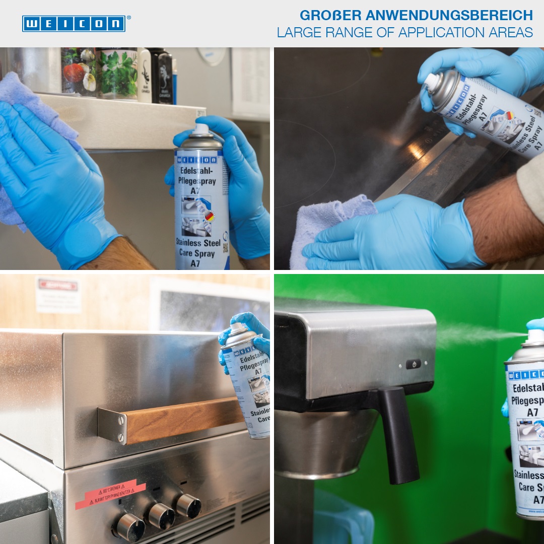 Lo Spray per Acciaio Inox è stato sviluppato per la pulizia, cura e protezione di superfici in acciaio inox, opache o lucidate delle aree sensibili. Questo spray speciale può essere utilizzato nell’industria alimentare, delle bevande, nelle mense, così come nel settore farmacologico e medicinale. Lo Spray possiede l’approvazione NSF (A7) e può essere utilizzato nel settore di lavorazione degli alimenti. Previene le impronte, toglie residui di grasso, riduce l’ossidazione e la corrosione, pulisce ampie superfici senza lasciare strisce, forma un film idrorepellente duraturo con effetto idrorepellente. Ha un effetto antistatico e aderisce anche su superfici perpendicolari.