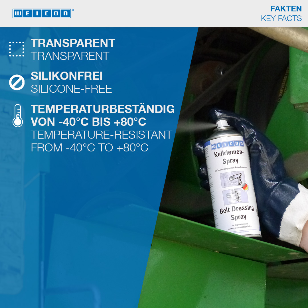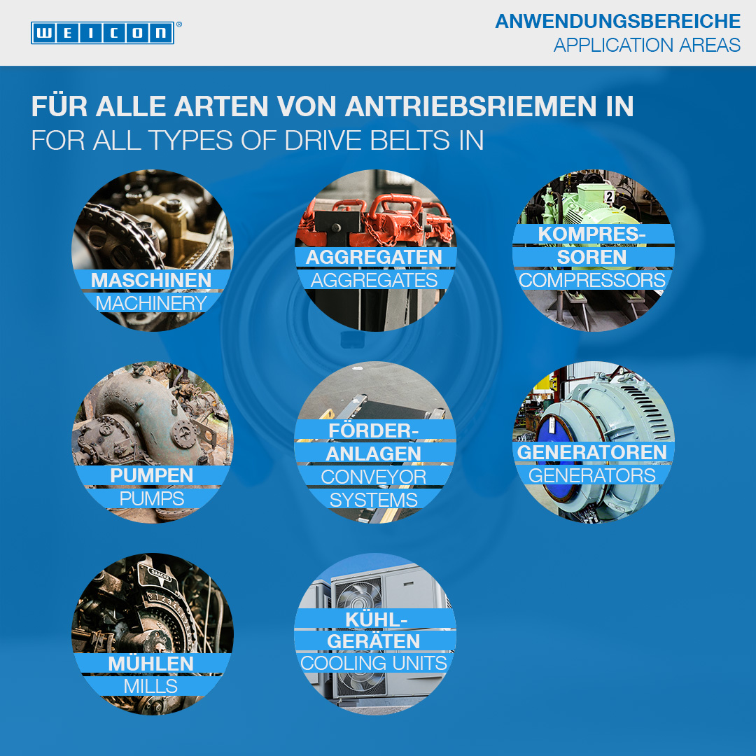 WEICON Spray per Cinghie è uno spray trasparente a base di elastomeri sintetici per diversi tipi di cinghie molto sollecitate. Aumenta la longevità, rallenta l’invecchiamento di macchine ed impianti, evita lo slittamento, permette di trasmettere la potenza totale di propulsione, elimina ed evita cigolii, penetra nei pori, aumenta l’efficacia della forza di trazione, aumenta la forza d’attrito e d’adesione, è antistatico e garantisce l’elasticità. WEICON Belt Dressing Spray è idoneo per tutti i tipi di cinghie in materiali tradizionali come tessuto, cuoio, gomma o PVC. Può essere utilizzato su cinghie trapezoidali, cinghie trapezoidali articolate, cinghie per trasmissioni, cinghie piatte, cinghie tonde, cinghie dentate, cinghie di trasmissione, nastri nervati o nastri trasportatori. WEICON Belt Dressing Spray è particolarmente idoneo per tutti i tipi di cinghie su macchine, aggregati, compressori, pompe, generatori, impianti di trasporto, mulini, trapani a colonna e su apparecchi di refrigerazione. Può essere utilizzato durante il processo di lavoro purché si rispettino le direttive di sicurezza.