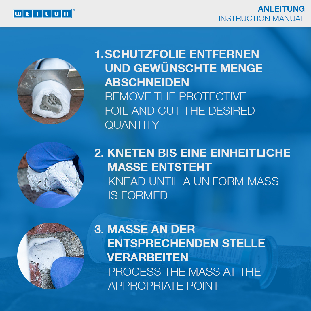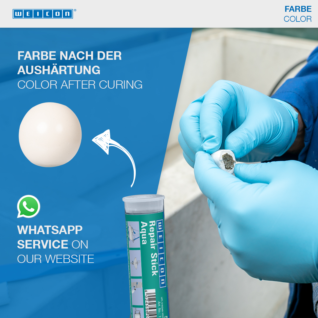 Ideal für schnelle Reparaturen auf feuchten und nassen Flächen, sowie für Unterwasseranwendungen. Zum Ausbessern und Abdichten von Rissen, Löchern, Leckagen und Undichtigkeiten an Benzin- und Wassertanks, Heizkörpern, elektrischen Schaltanlagen, Sanitäreinrichtungen und in Schwimmbädern. WEICON Repair Stick Aqua kann im Sanitär- und Heizungsbau, im Elektrobereich, im maritimen Bereich und in vielen weiteren Bereichen der Industrie eingesetzt werden.
