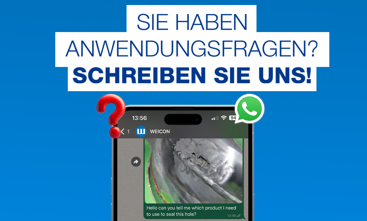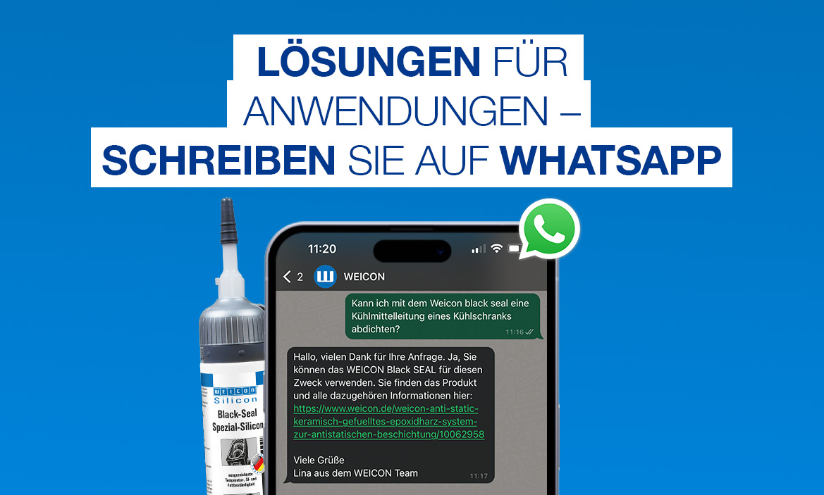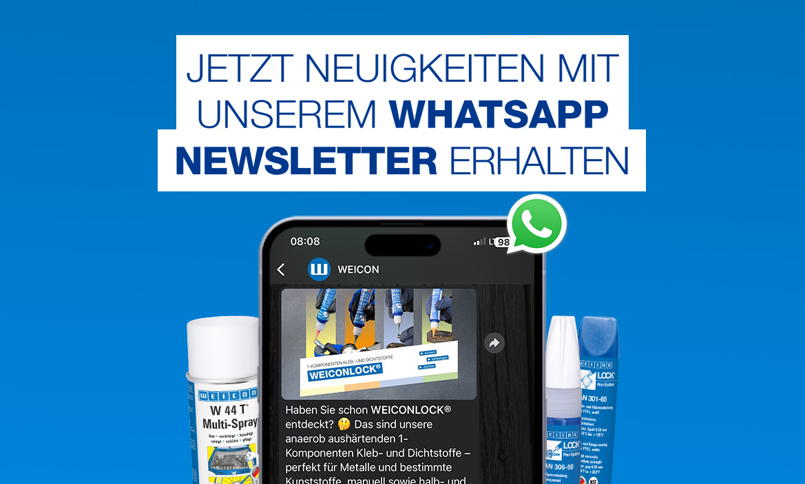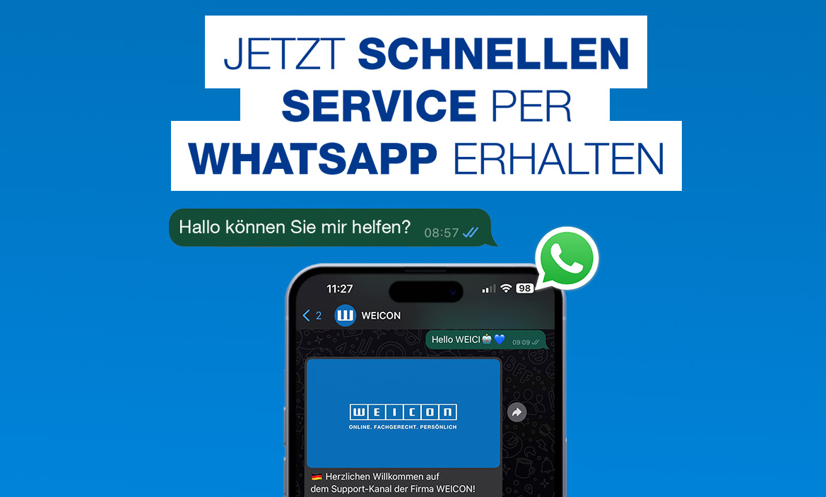 Möchten Sie uns jederzeit und überall kontaktieren, Fotos Ihrer Anwendung senden oder den WEICON TOOLS-Finder verwenden? Haben Sie Fragen zu unseren Produkten, suchen schnell die passende Ansprechperson oder möchten bequem per WhatsApp bestellen? All das haben wir für Sie ermöglicht! Nutzen Sie unseren WhatsApp Service oder abonnieren Sie unseren WhatsApp-Newsletter oder unseren neuen WhatsApp-Channel.