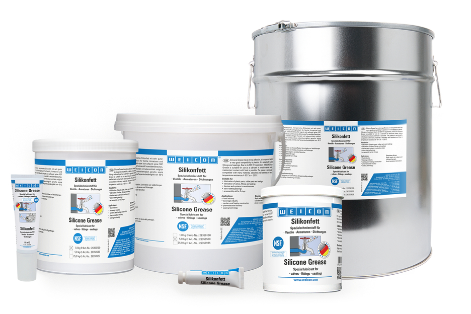 WEICON Silikonfett ist haftstark und transparent und hat eine sehr gute Kunststoffverträglichkeit. Aufgrund der NSF H1-Registrierung eignet es sich als Schmierstoff für Ventile, Armaturen und Dichtungen in sensiblen Bereichen. Entspricht den KTW Leitlinien des Umweltbundesamtes für den Kontakt mit Trinkwasser. Es kann in der Lebensmitteltechnik, in der Getränkeindustrie, im Sanitär- und Heizungsbereich, in der Pharmaindustrie und in der Dichtungstechnik zum Einsatz kommen. WEICON Silikonfett ist BAM geprüft und sicherheitstechnisch beurteilt - siehe Merkblatt M 034-1 "Liste der nichtmetallischen Materialien für den Einsatz in Sauerstoff" (DGUV Information 213-075) der BG RCI. Das Fett ist besonders materialverträglich, geruchs- sowie geschmacksneutral und hat eine Temperaturbeständigkeit von -50 °C bis +200 °C. WEICON Silikonfett eignet sich für das Schmieren von Kunststoffteilen, Gummiteilen und -abdichtungen, das Schmieren von Ventilen, Armaturen und Dichtungen, für Geräte und Anlagen, für langsam drehende Lager und als Montagehilfe für O-Ringe.