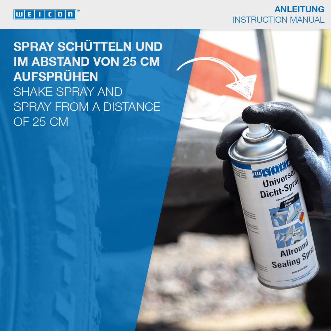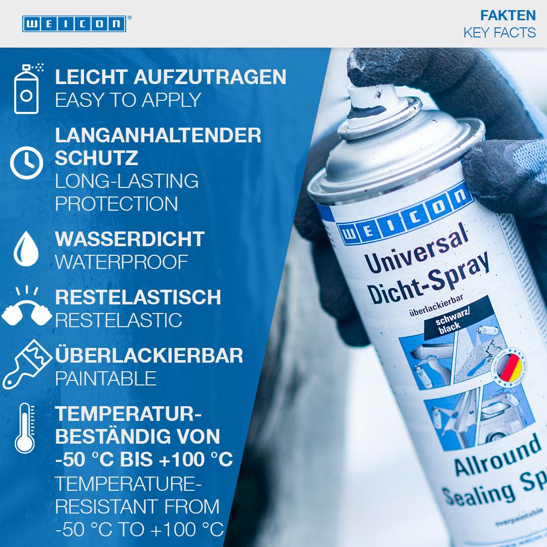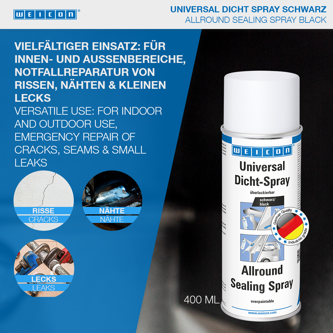 WEICON Universal Dicht-Spray ist ein haftstarker, sprühbarer Kunststoff zur Abdichtung von Undichtigkeiten. Es wurde speziell für das Abdichten feinster Risse und Nähte im Innen- und Außenbereich entwickelt. Es kann zum einfachen Abdichten in den verschiedensten Anwendungen verwendet werden, wie an Dachrinnen, Abwasser- und Abflussrohren, Wohnwagen, -mobilen und Booten, Dächern und Fenstern, Poolwänden und Teichfolien, Kellerschächten und an Lüftungsschächten. Universal Dicht-Spray haftet auf vielen Oberflächen, wie zum Beispiel Stein, Metall, Kunststoff, Holz, Emaille, uvm. Das Spray ist überlackierbar, wasserfest und witterungsbeständig. Es schützt Metalle vor Korrosion und ist frei von Bitumen und Silikon.