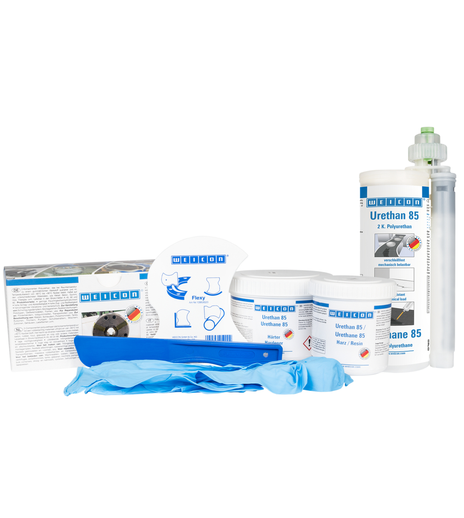 WEICON Urethan 85 ist ein 2-K Polyurethan-Spachtelkitt mit ausgezeichneter mechanischer Festigkeit zur schnellen Reparatur, Ausbesserung und Beschichtung von Gummi- und Metallteilen, die Stößen, Abrieb, Vibration oder Bewegung ausgesetzt sind. Es verfügt über eine hohe Elastizität sowie eine hohe Verschleißbeständigkeit. Urethan 85 eignet sich für zahlreiche Anwendungen, wie die Reparatur von Gummiteilen und Förderbändern, die Reparatur und Ausbesserung von Gummibeschichtungen, als flexibler Verschleißschutz bei Pumpengehäusen und Laufrädern und zur schnellen Reparatur verschlissener Dichtungen und Gummiwalzen.
