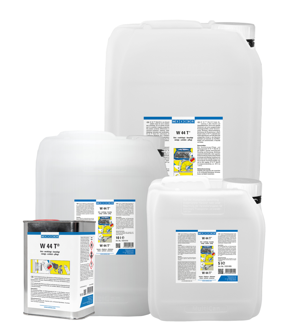 WEICON W 44 T® ist ein Multifunktionsprodukt und vereint durch eine spezielle Wirkstoffformel und hervorragende Kriecheigenschaften Korrosionsschutz, Wasserverdrängung, Schmierung, Konservierung und Reinigung in einem Produkt. Es löst festgefressene Verschraubungen, Bolzen, Armaturen und Ventile, durchdringt und löst Rost. Es verdrängt Feuchtigkeit von elektrischen Kontakten, verhindert Kriechströme und erleichtert das Starten nasser Motoren. W 44 T eignet sich auch als Schneidöl für Bohr- und Schneidvorgänge. Das Öl beseitigt Quietsch- und Knarrgeräusche an Scharnieren, Führungen, Lagern und allen Arten von Gelenken und Kupplungen. W 44 T reinigt verschmutzte Metalloberflächen und hinterlässt einen lang haftenden, hauchdünnen Film, der nicht schmiert oder klebt und keinen Staub anzieht. Es schützt und pflegt alle Werkzeuge, Maschinen sowie elektrische und mechanische Präzisionsgeräte und hält sie funktionsfähig.